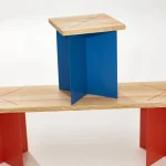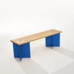 OHUS bench is pure minimalism. Four signal-coloured steel discs and an ash panel, united by two crosses. A visual design highlight and intelligent modular furniture for modern nomads, multifunctional, portable and easy to dismantle. Ideal as a bench, sideboard or side table for private and public spaces, cafés, museums, schools. Stacked to save space, the bench becomes a high shelf or room divider. OHUS bench stands for young German furniture design at its best.