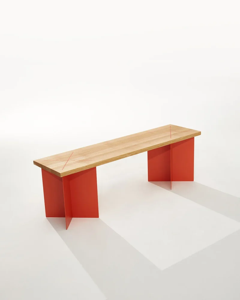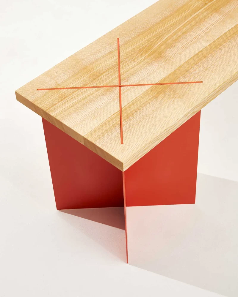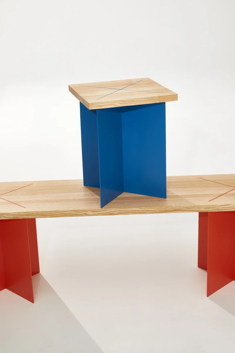 The minimalist Church of Light by architecture autodidact Tadao Andō inspired design autodidact Daniel Heilig to create the boldly conceived, radically reduced bench architecture OHUS. Crossed, interlocking steel legs ending flush with the two milled X sitting surface. Archaic materials, firmly connected by 8 concealed screws. 3 mm powder-coated steel for stability. OHUS is available as a bench and a stool.