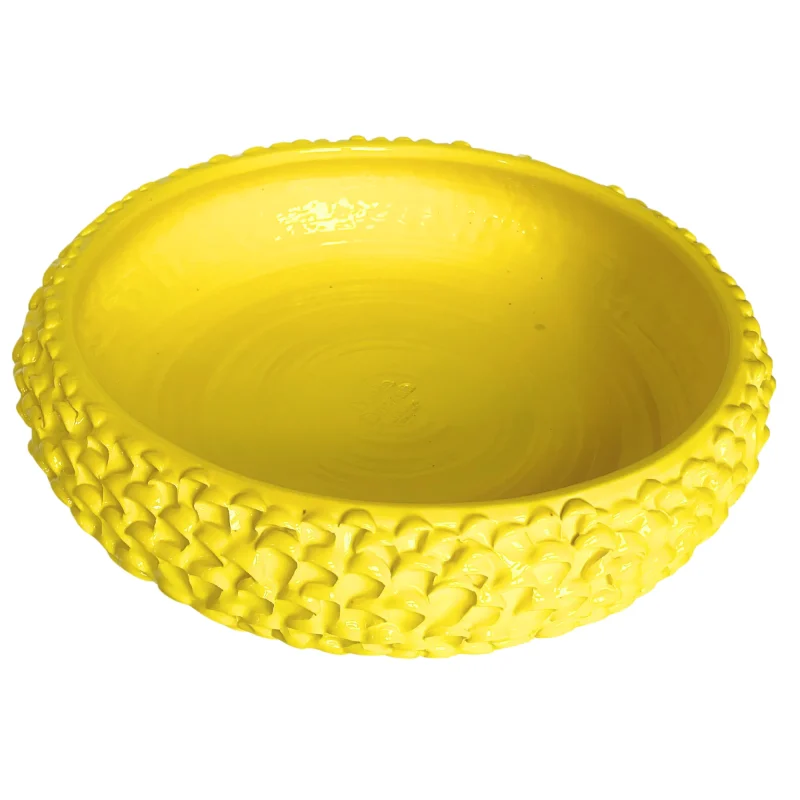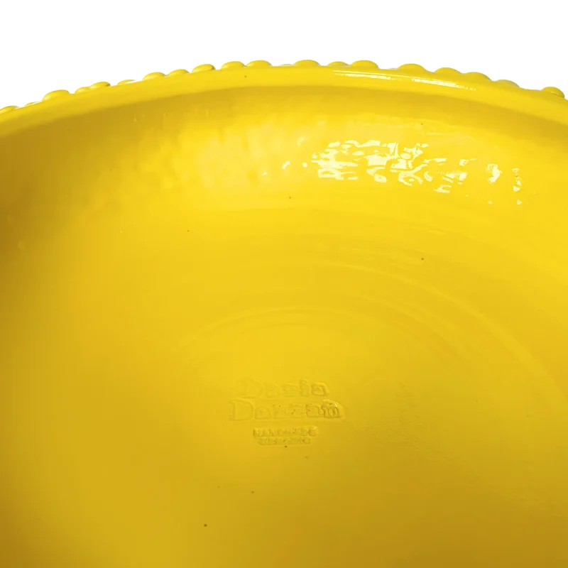 This presentation plate in cadmium yellow is a striking ceramic centerpiece designed to command attention. Versatile in its use, it serves as both a decorative object and a magnificent platter for serving spaghetti for up to eight people, adding elegance to any dining experience. Daria Dazzan creates her works at the intersection of design, ceramics, and sculpture, blending her background in haute couture fashion and textiles into every piece.