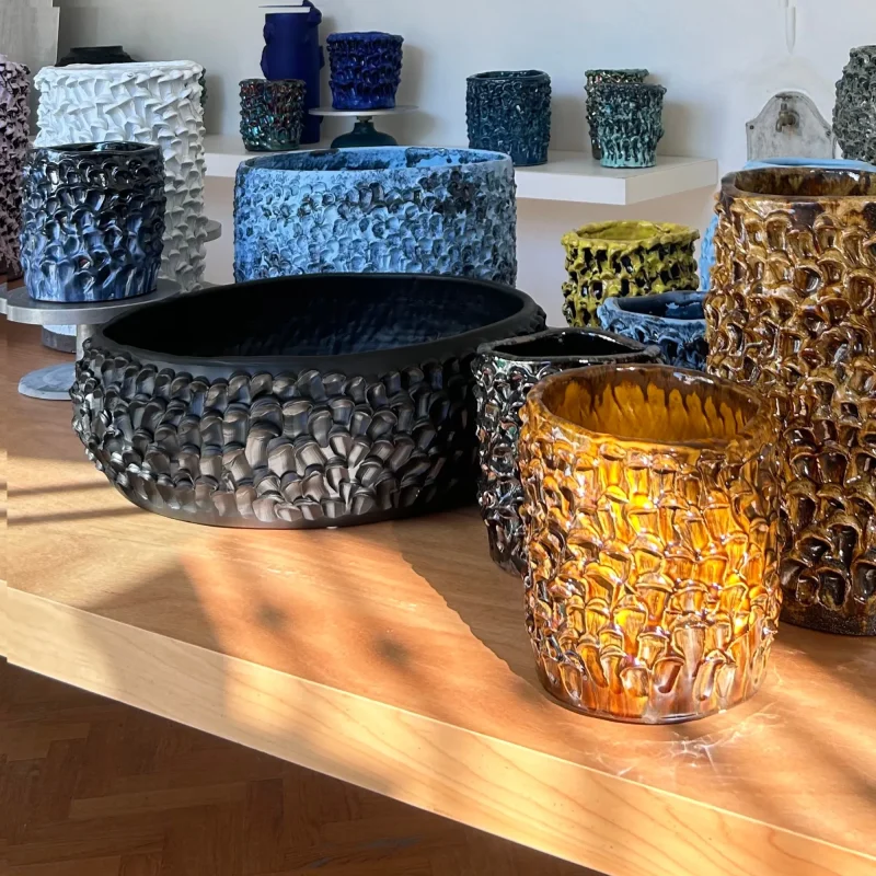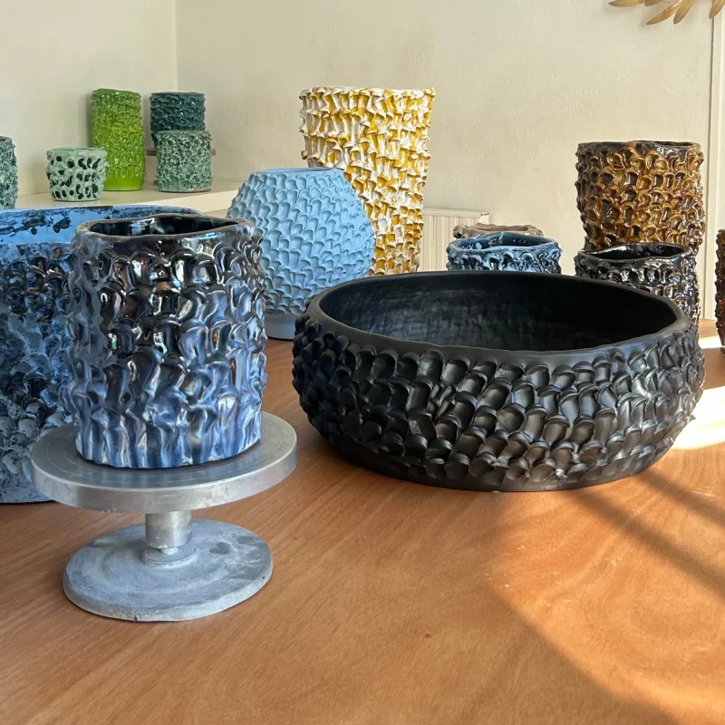 The Onda Series, inspired by the Italian word for “wave,” features textures reminiscent of gentle ripples, crafted with the artist’s thumb in a gestural, organic movement—like embroidery on clay.