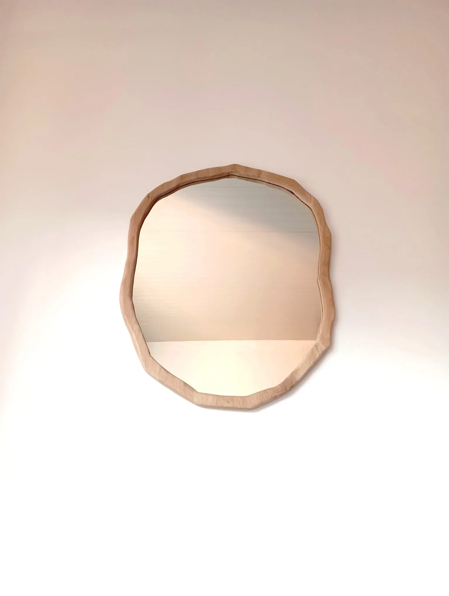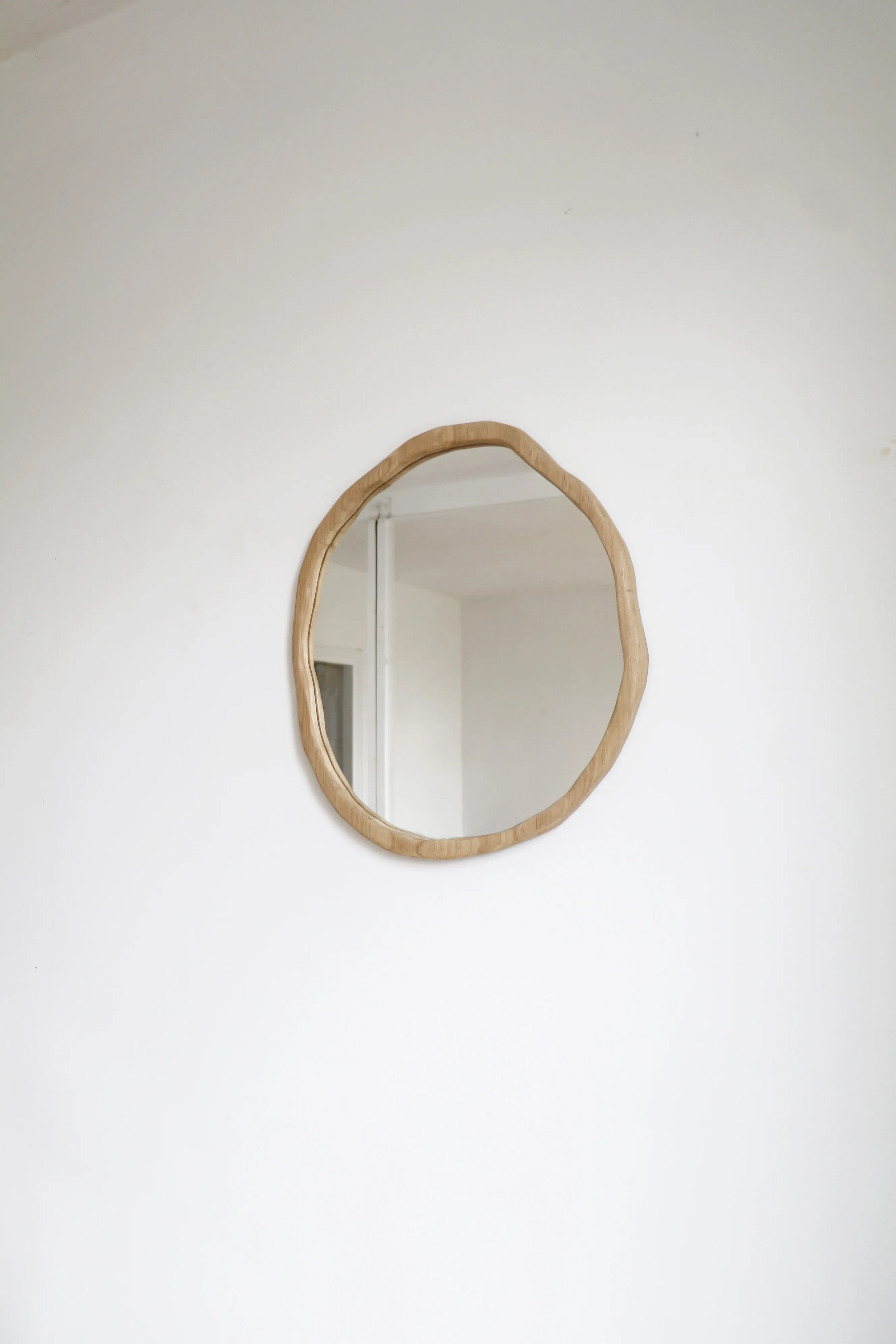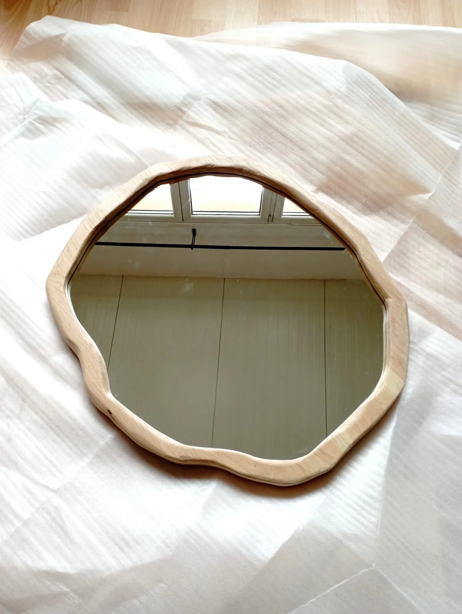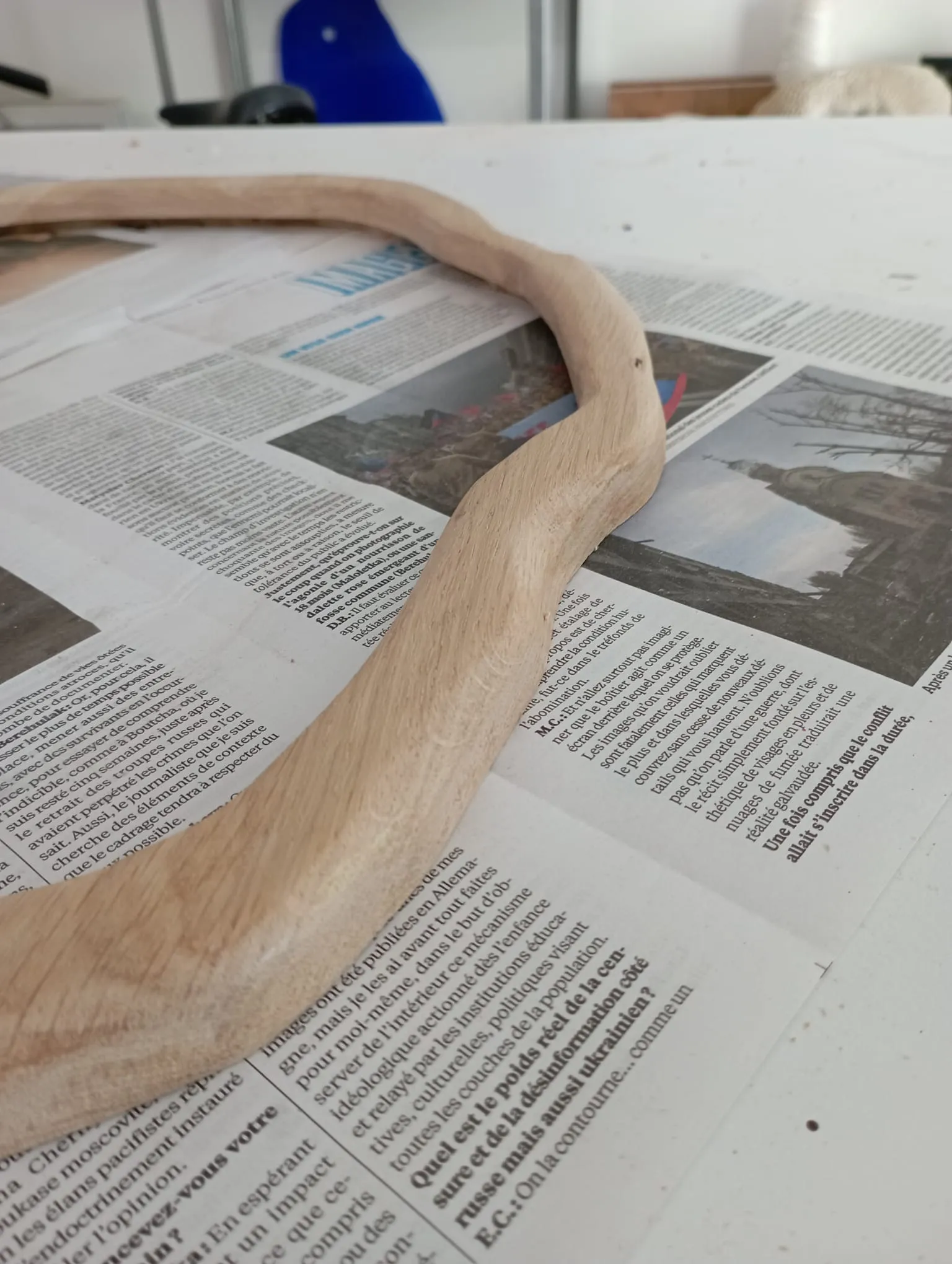 The “Ondulation Mirror” gradually takes shape as it is cut. The oak that follows the shape of the mirror is carved with a chisel and then sanded until its surface is as soft as silk. It is available in light or dark varnish and goes perfectly with other formats.