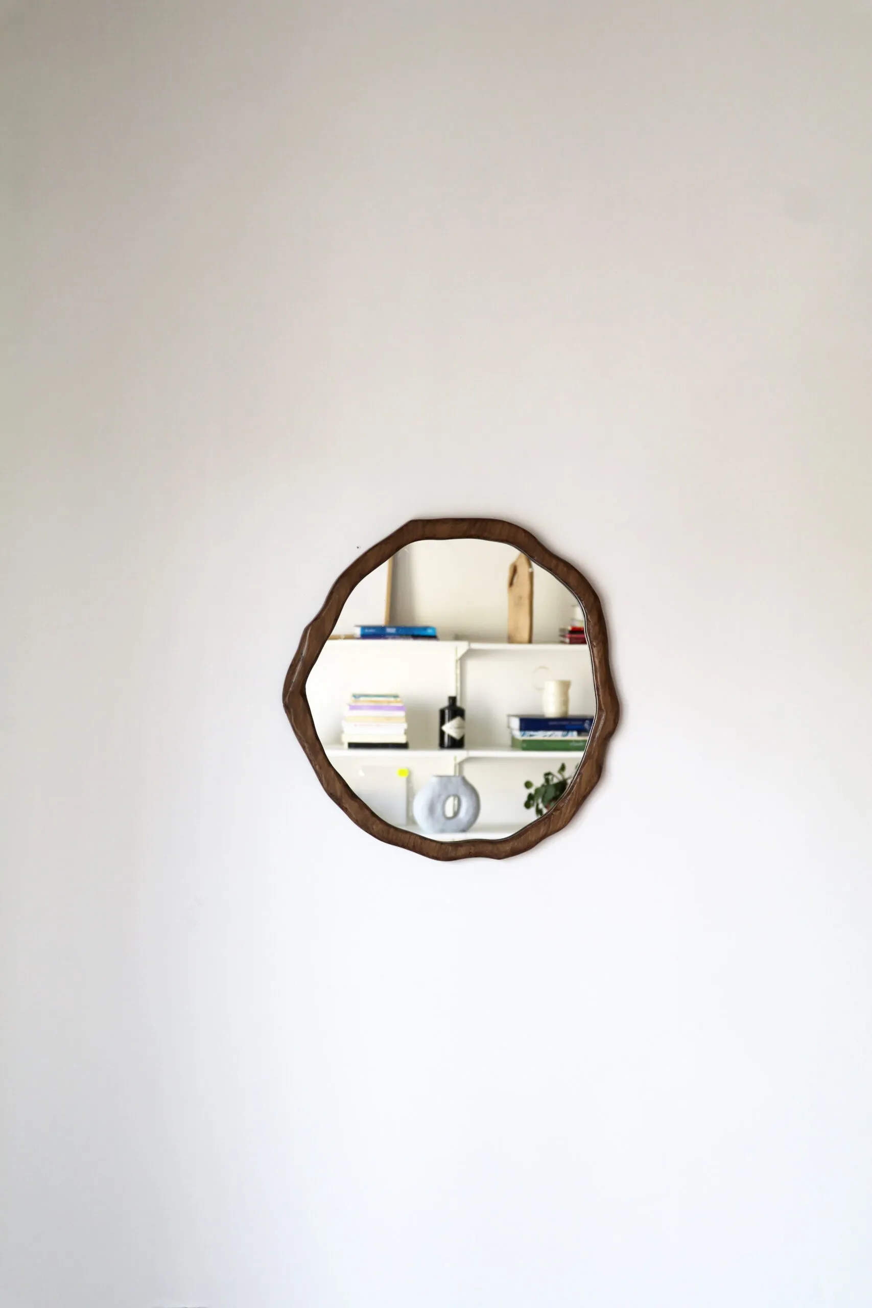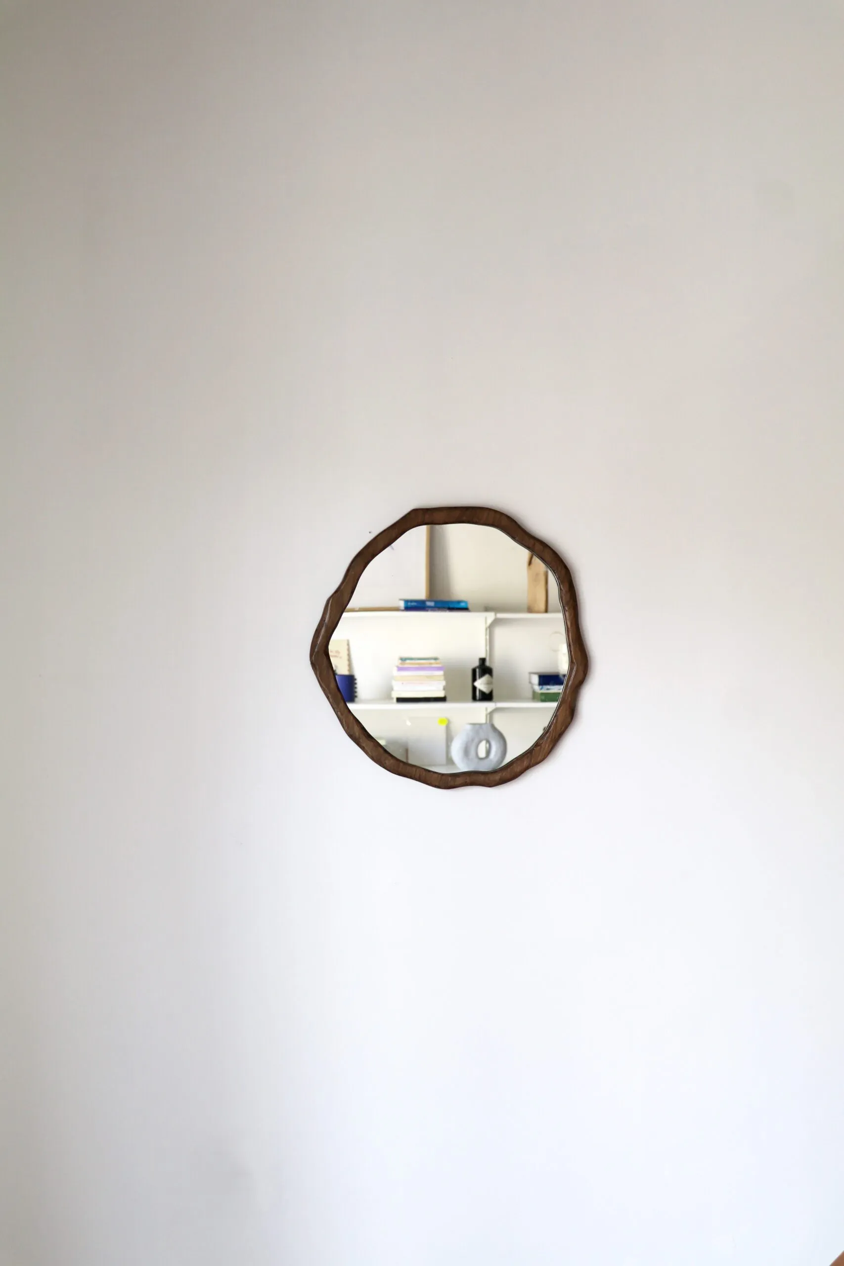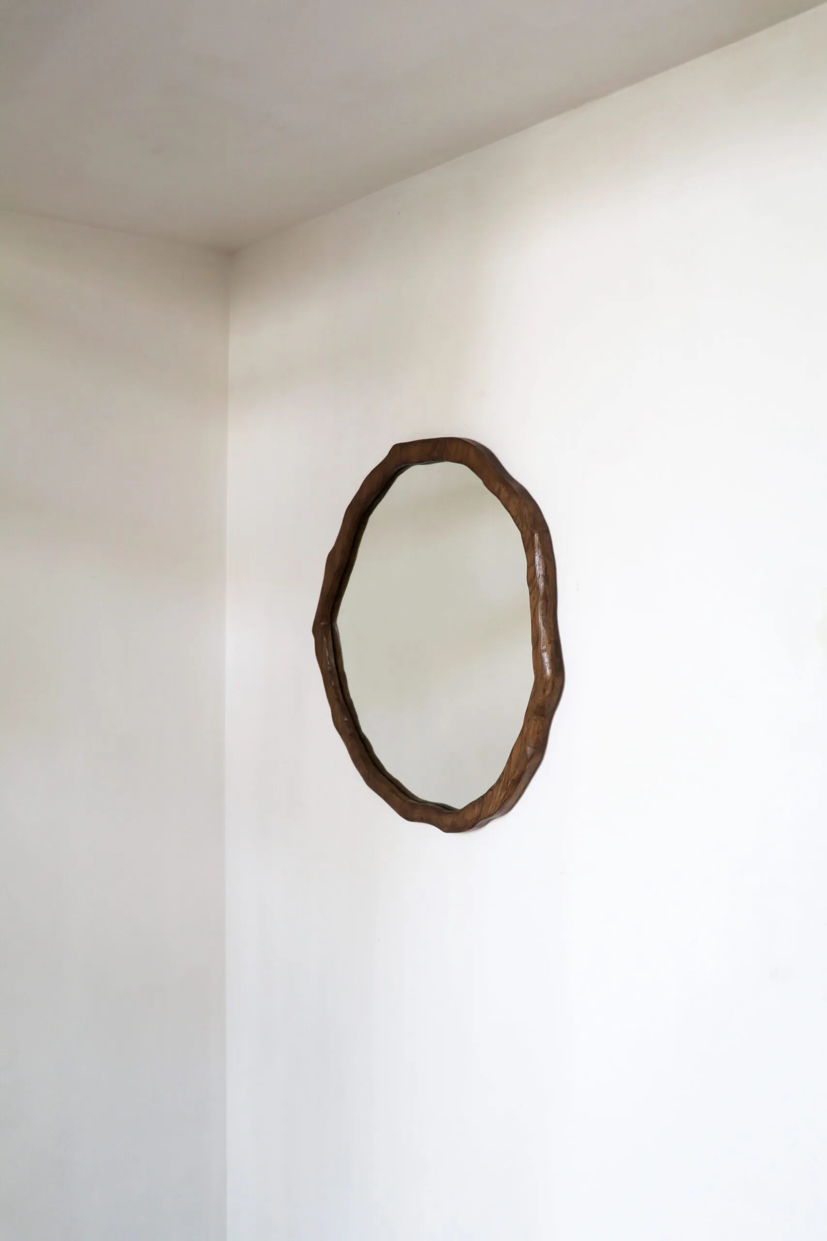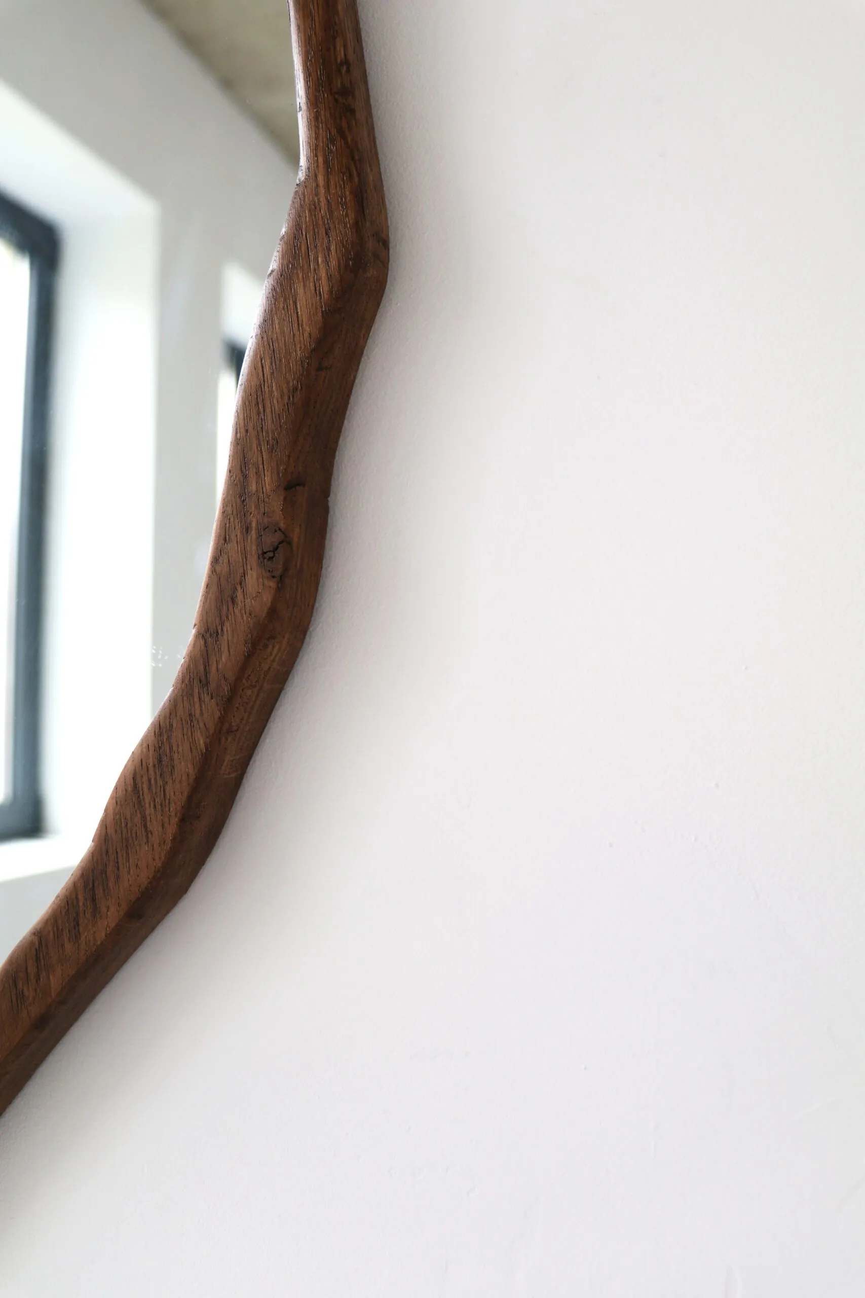 The “Ondulation Mirror” gradually takes shape as it is cut. The oak that follows the shape of the mirror is carved with a chisel and then sanded until its surface is as soft as silk. It is available in light or dark varnish and goes perfectly with other formats.