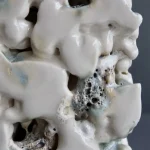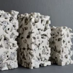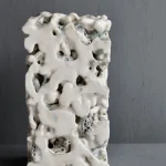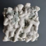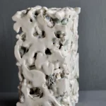 The sculpture is made of plants collected in nature and dipped several times in liquid porcelain. The plants conserved in raw porcelain are puzzled up in a mould, leaving an impression of natural growth limited by invisible boarders. An organic patten is drawn by itself at the surfaces due to the natural plants and the way the liquid porcelain works.