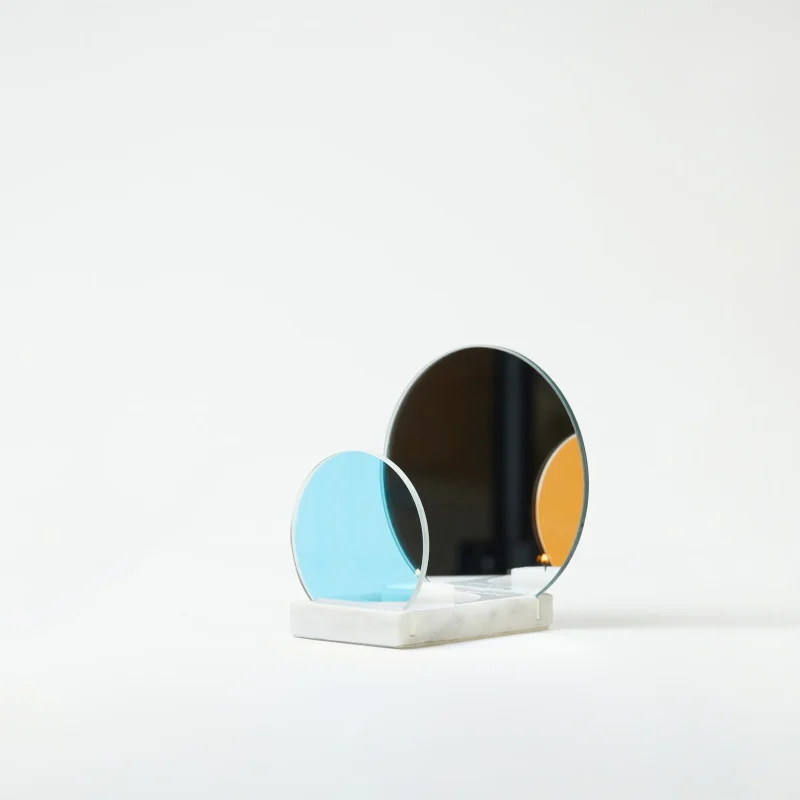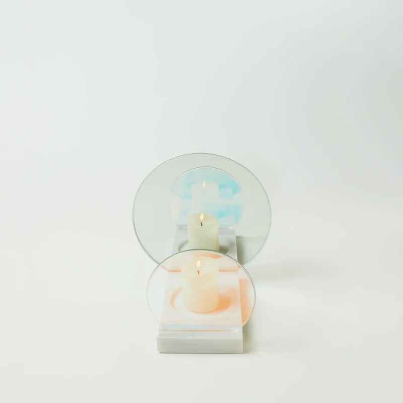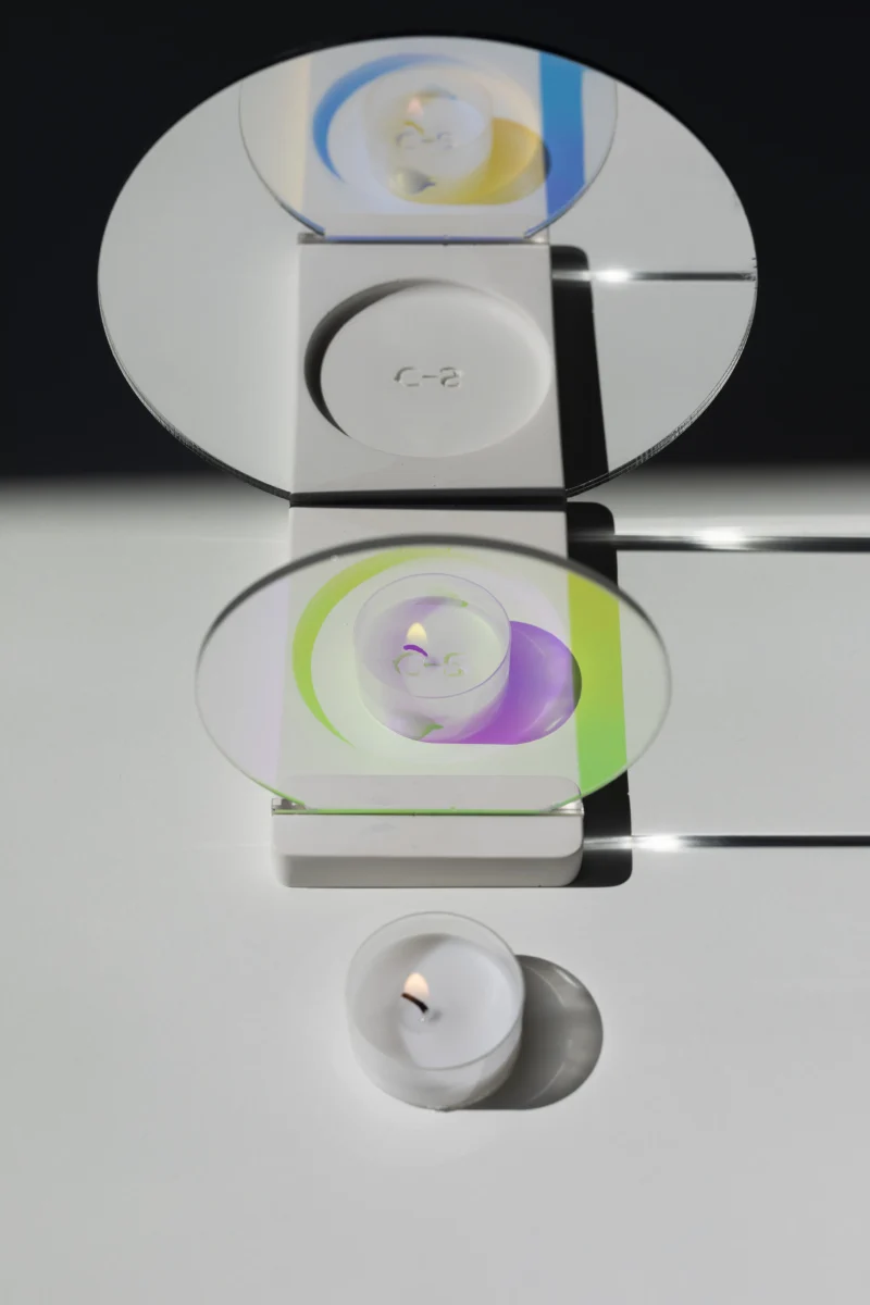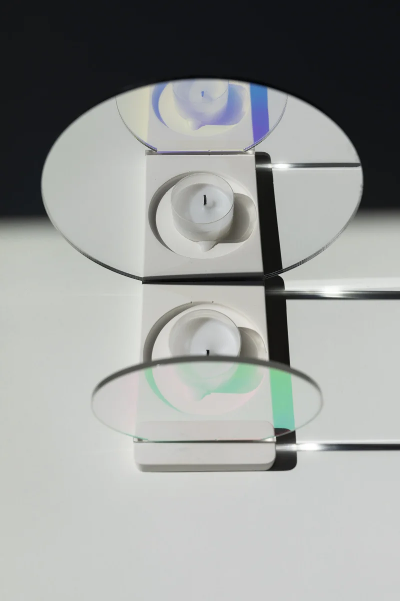 Onnda Flame is a collection of candle holders with infinitely mirrored flames trailing off into the colorful abyss. Paying homage to the primordial element, Onnda Flame places fire at the heart of otherworldly objects. The candle holder’s concentric design casts shifting, colorful shadows that change with the time of day, light source, and viewing angle, revealing a dynamic play of shades, reflections, and shadows. Made from fine dichromatic glass, each piece gives off soft, dreamlike colors that create a gentle gradient of light in the surrounding space.