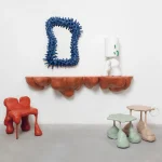 The presented pieces were hand modelled with paper pulp and structured with plywood and metal profiles. Some of them received ceramic elements, a technique that is also explored in the designer’s studio. After being modelled and dried, all of the objects were coated with kaolin mortar, acrylic resin, or automotive varnish.