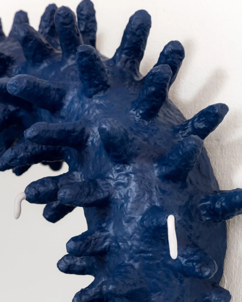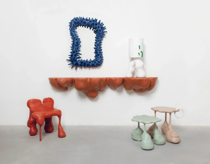The presented pieces were hand modelled with paper pulp and structured with plywood and metal profiles. Some of them received ceramic elements, a technique that is also explored in the designer’s studio. After being modelled and dried, all of the objects were coated with kaolin mortar, acrylic resin, or automotive varnish.