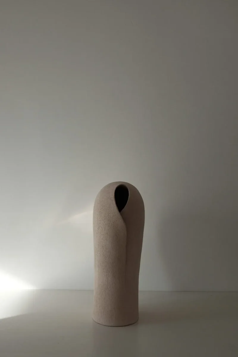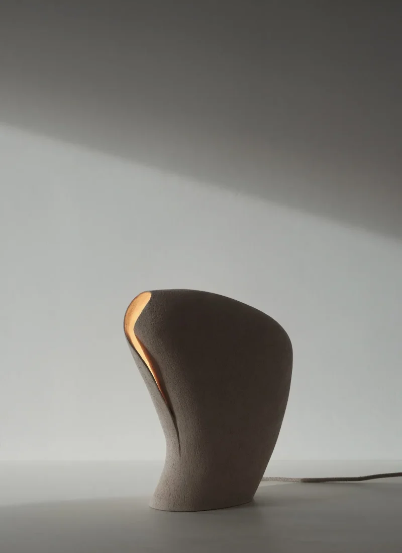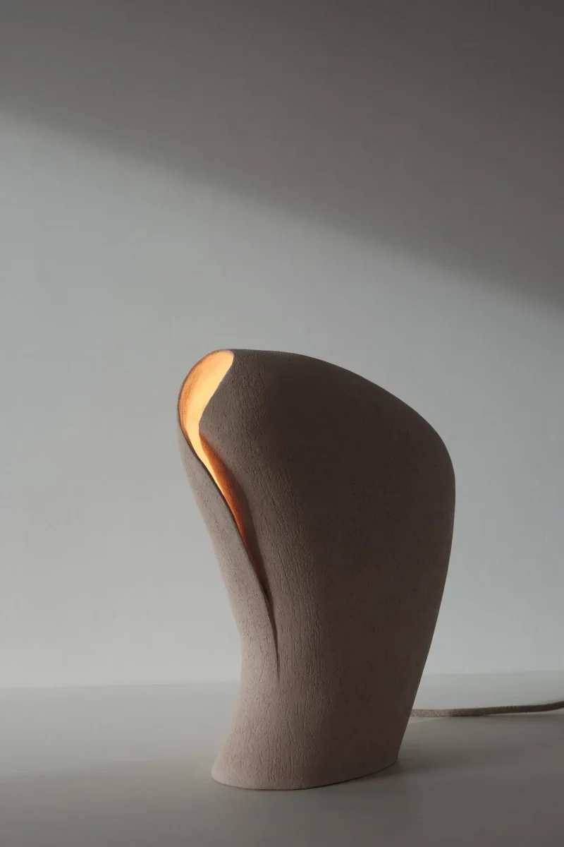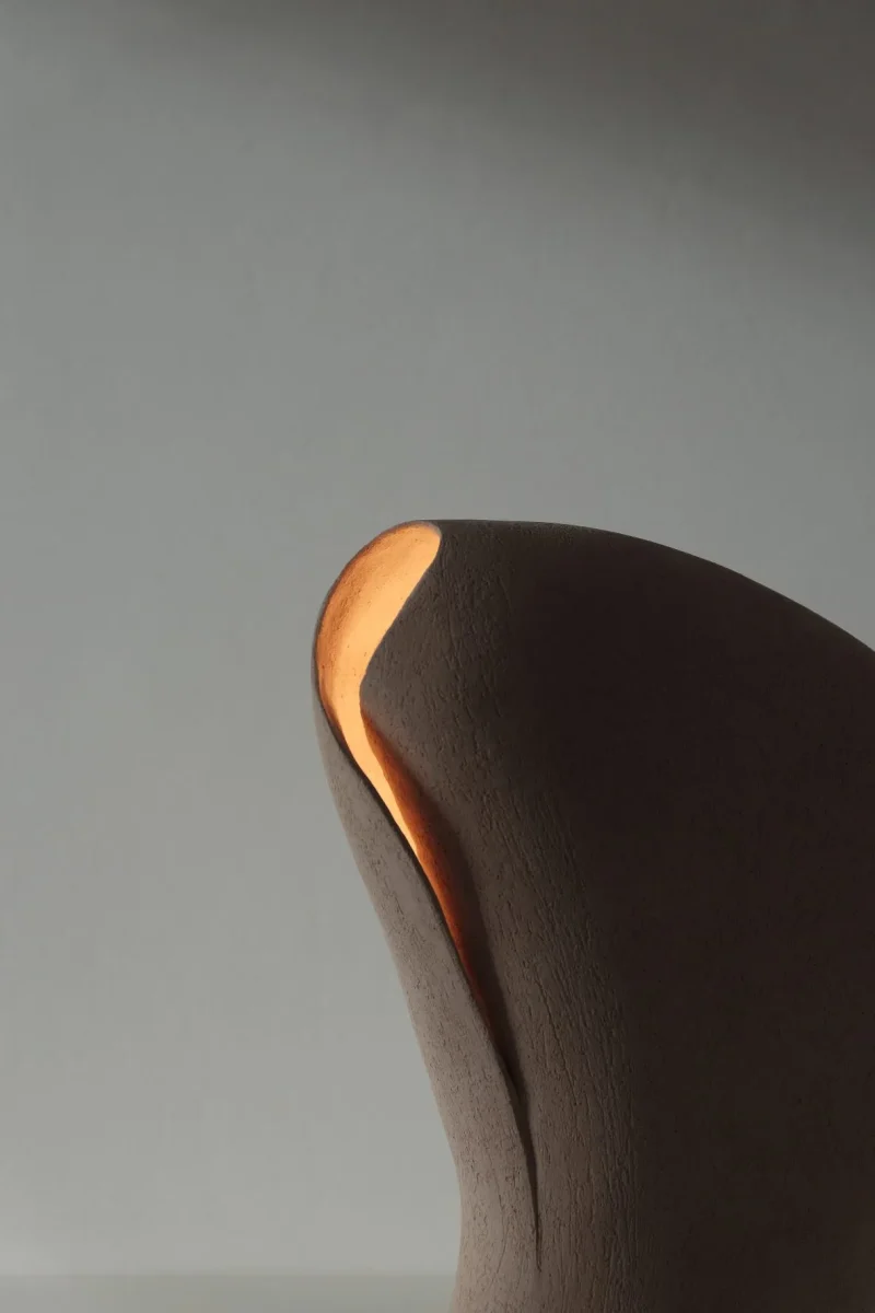 Oris is a ceramic lamp by Andrei Clontea STUDIO shaped with fluid, natural lines that reflect the subtle movement of organic forms. Its surface, textured to reveal a raw, earthy finish, brings warmth and depth to its surroundings. When lit, Oris casts a soft, golden light that recalls the warm glow of evening, filling the space with a gentle ambiance. The interplay of light and shadow across its curves highlights its sculptural presence, making Oris as much an object of art as it is a source of light.