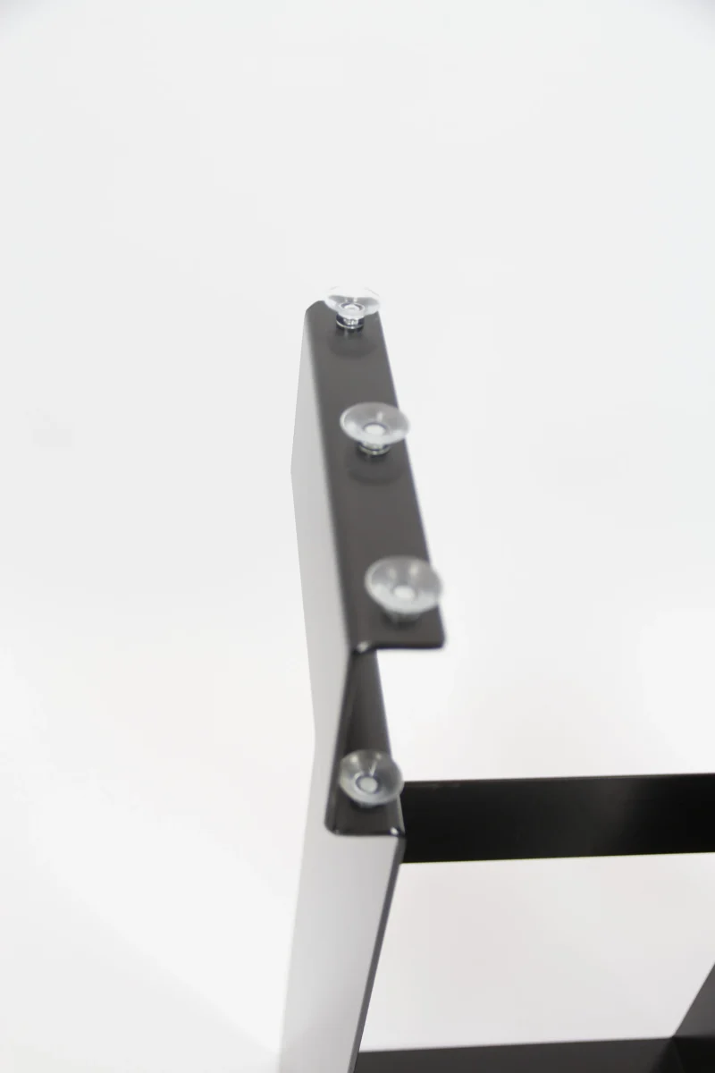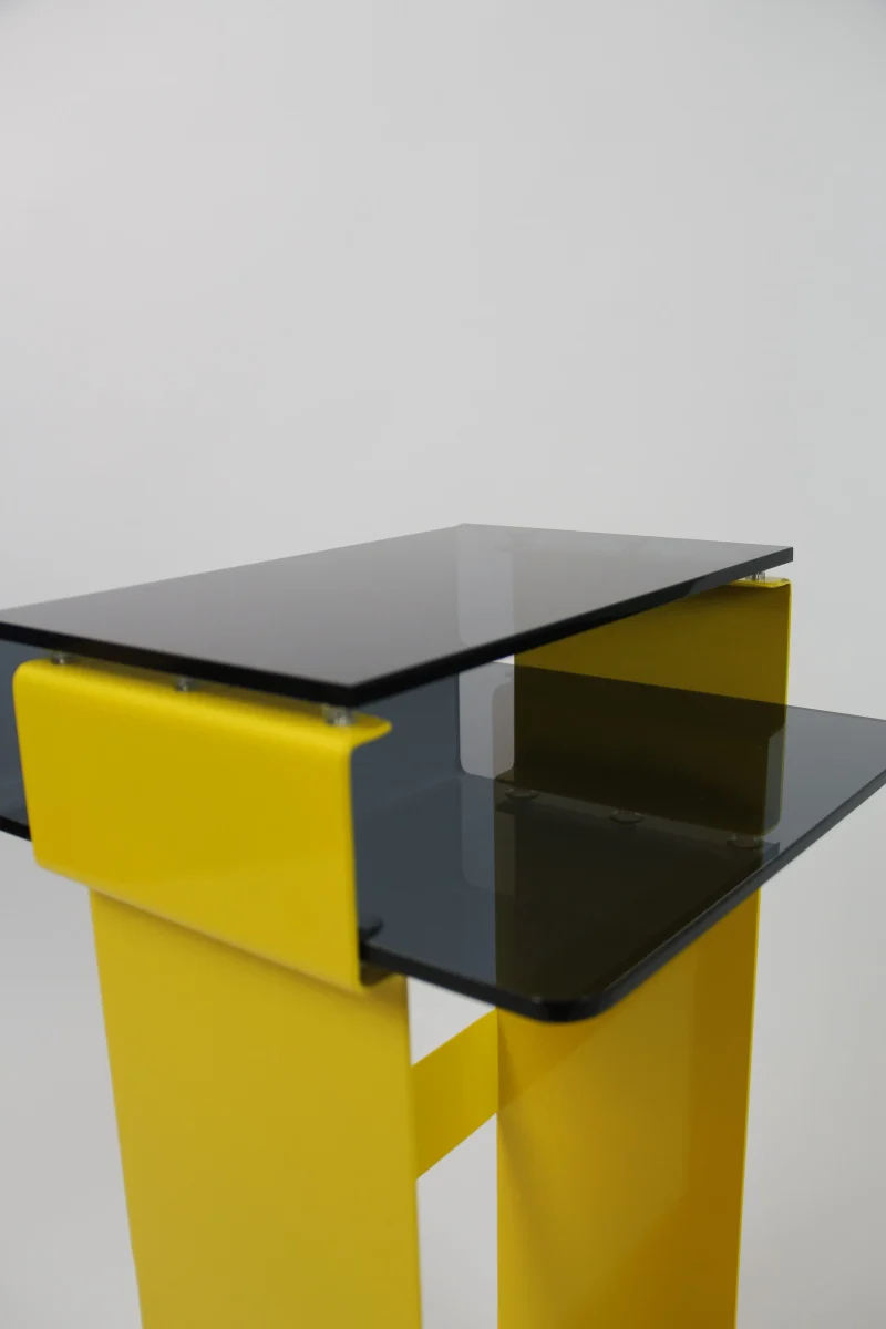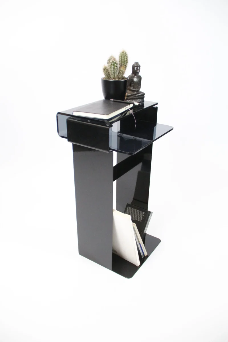 Crafted by German design studio ROI B, the OT Sidetable embodies radical minimalism with its carefully arranged combination of powder-coated rectangular and circular elements. This versatile piece offers a visual metamorphosis, shifting from an airy and delicate silhouette to a more substantial and robust presence, depending on the observer’s viewpoint. Designed for multifunctional use, it features bent Plexiglas storage compartments supported by suction cups, providing flexible storage for reading materials in various orientations. Its flat top surface offers an ideal space for highlighting decorative accessories, harmonizing form and function effortlessly.