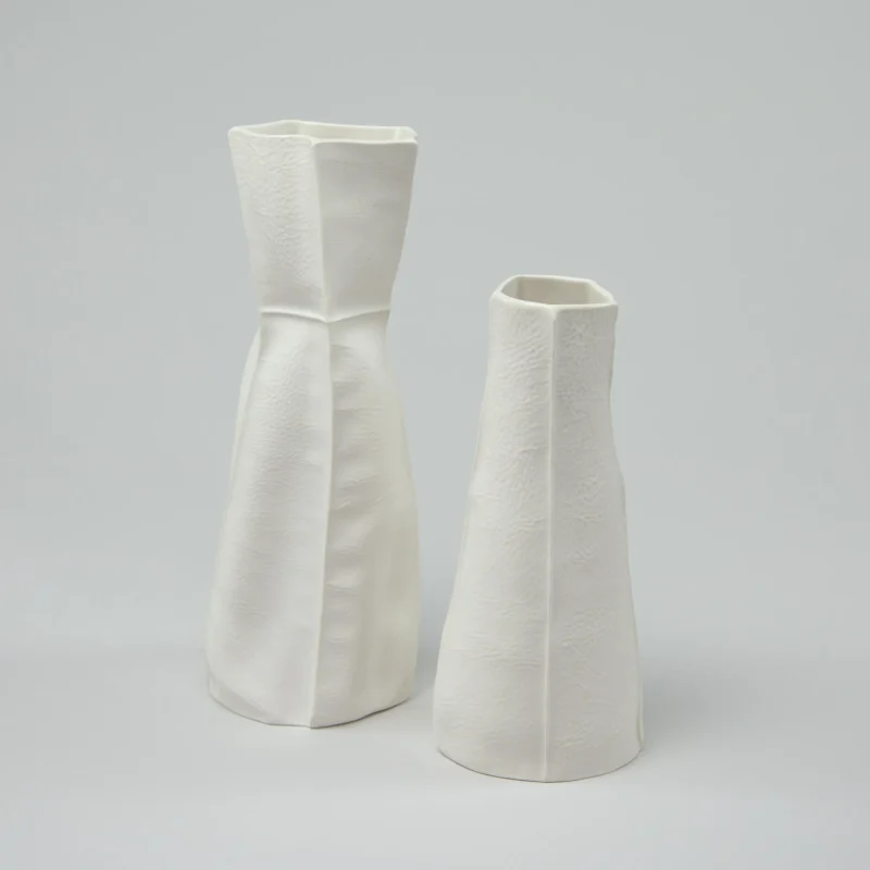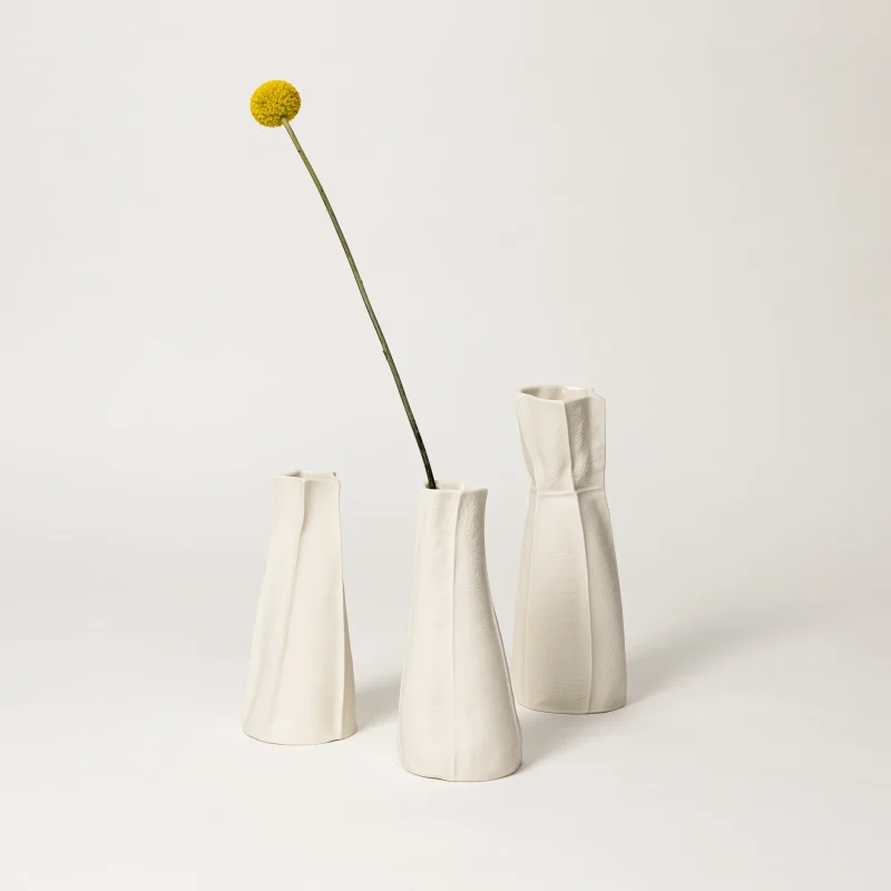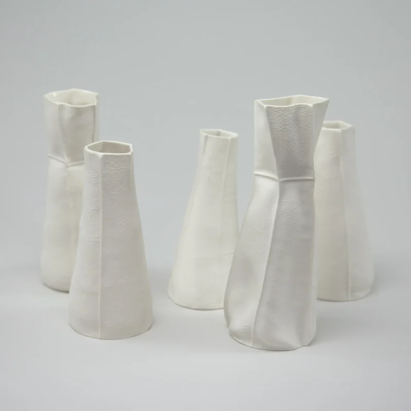 The Kawa Series is crafted using an unusual, painstakingly refined technique unique to Luft Tanaka. Each creation begins as a simple sketch and transforms into a leather mold. After cutting, sewing, and preparing the mold for casting, liquid porcelain is poured inside, slowly forming a thin layer along the leather surface. Once the porcelain sets, the mold is carefully cut at the seams and gently peeled away, allowing the piece to be fired in a kiln.