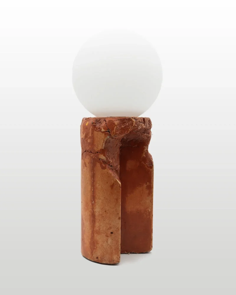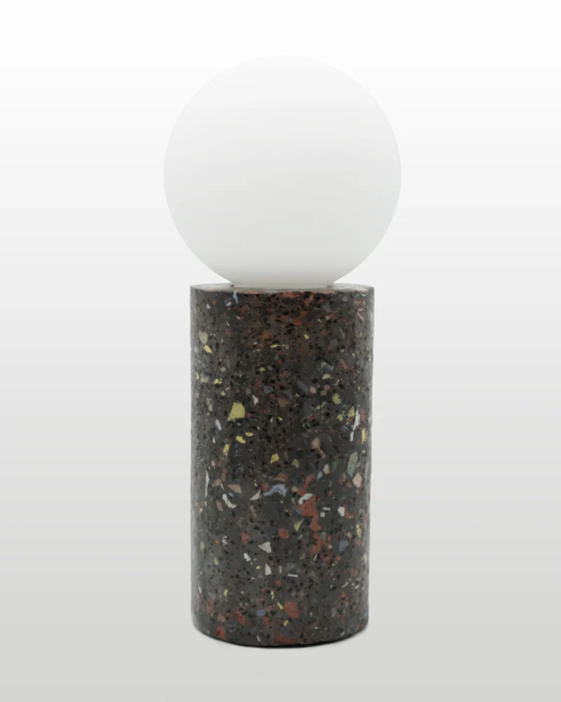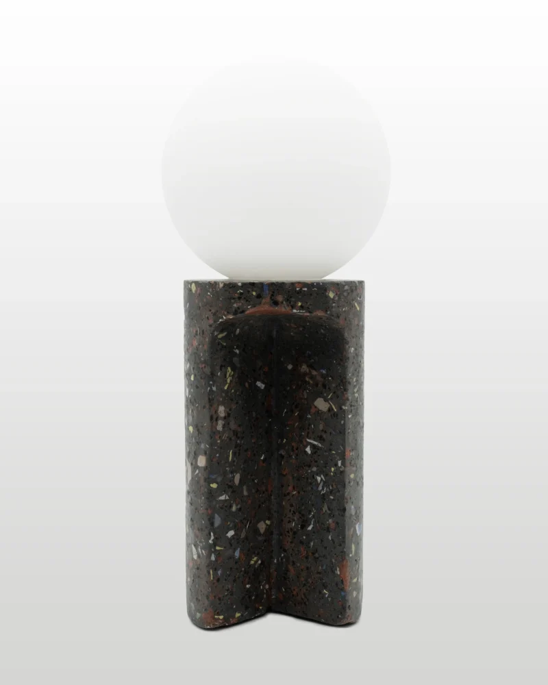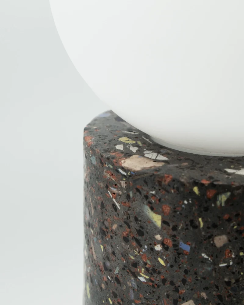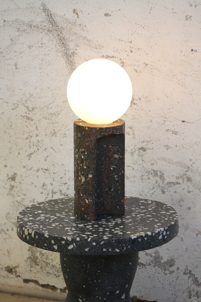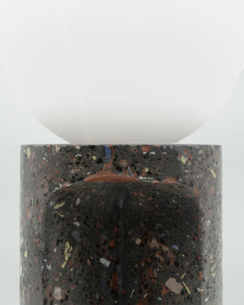 Made of a terrazzo formulated with recycled materials from the studio, this lamp was purposefully broken and re-assembled. It was then coated with natural pigments and sealed.