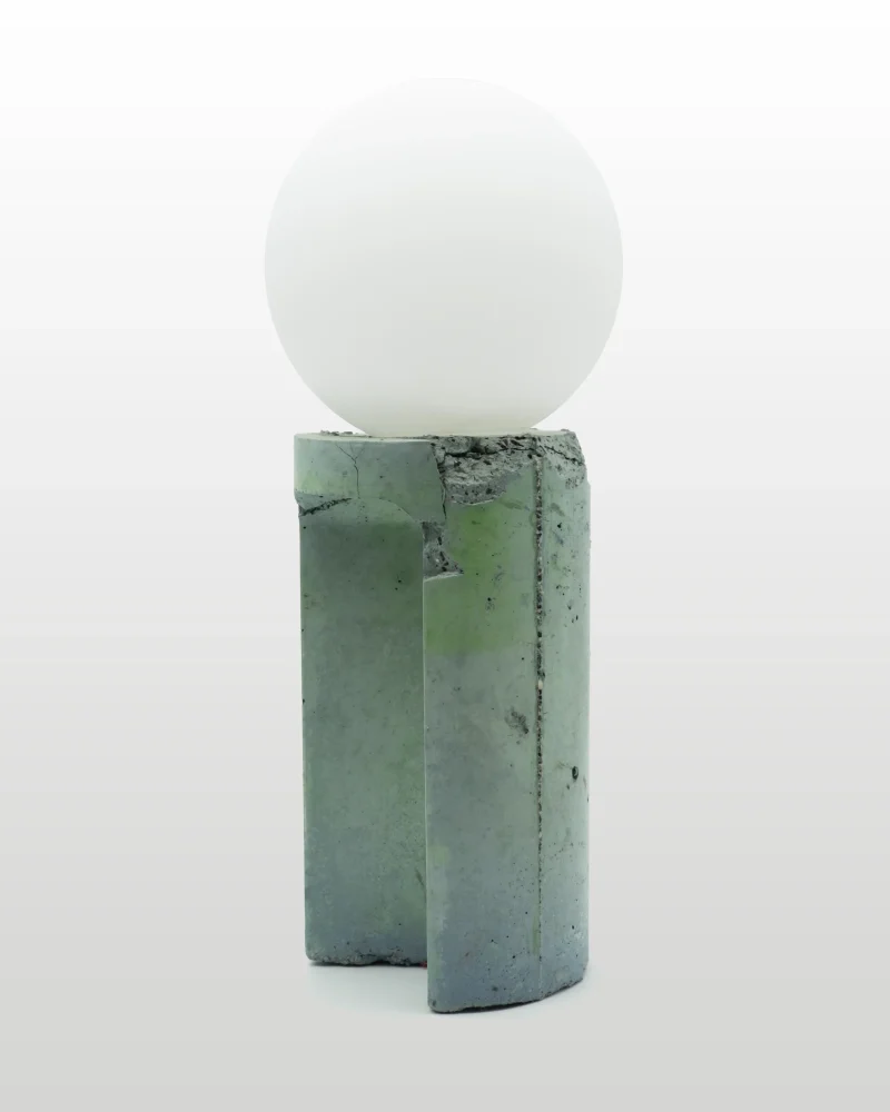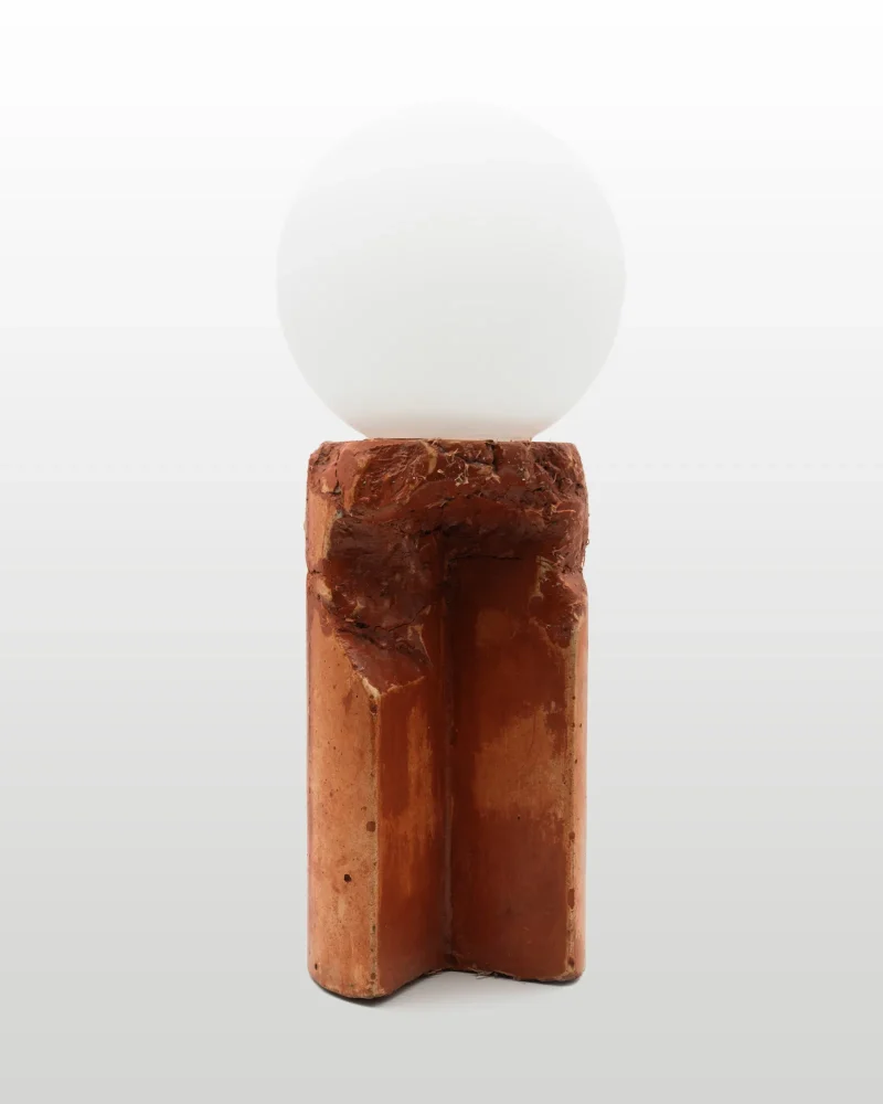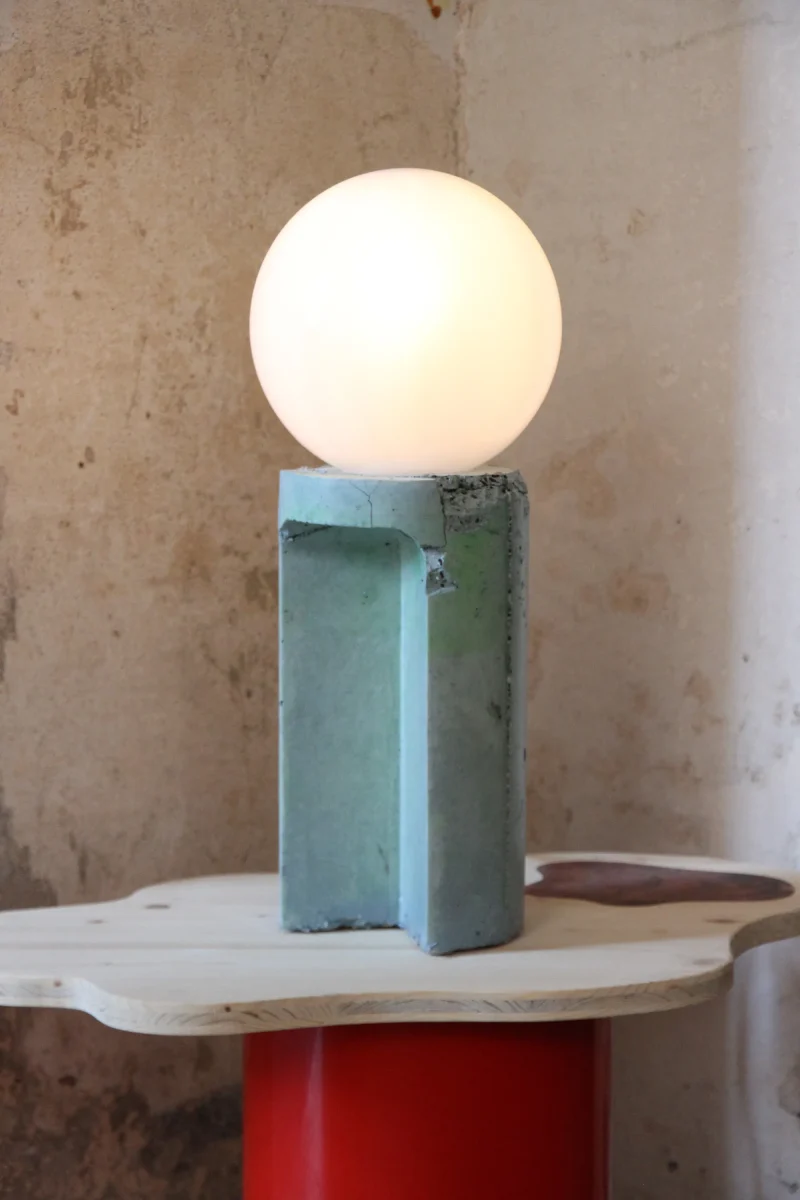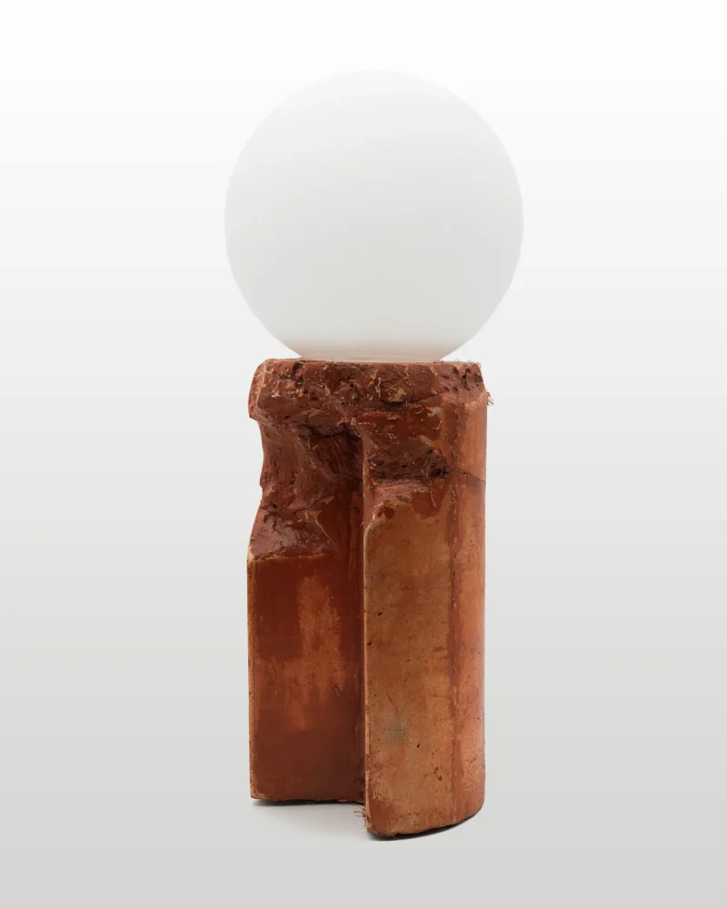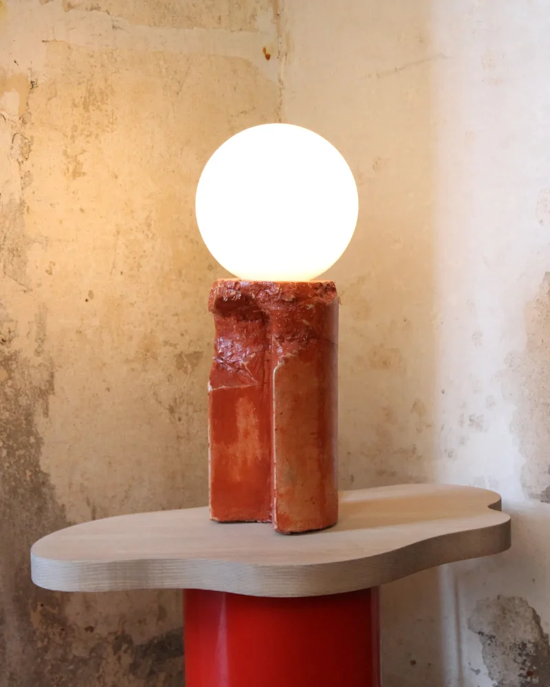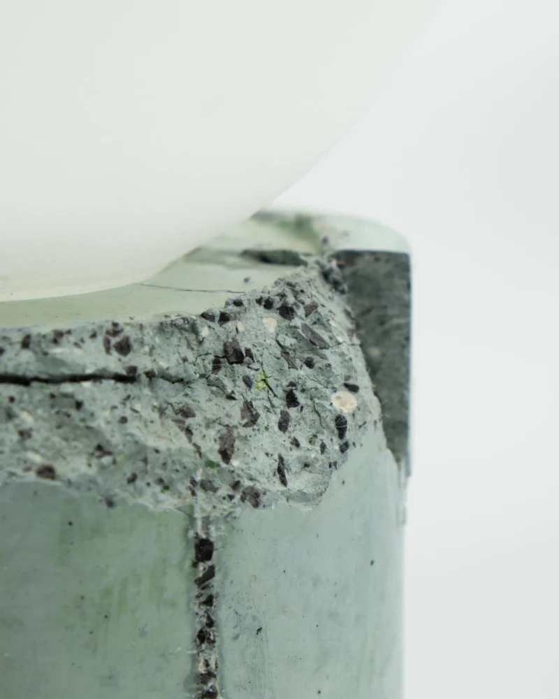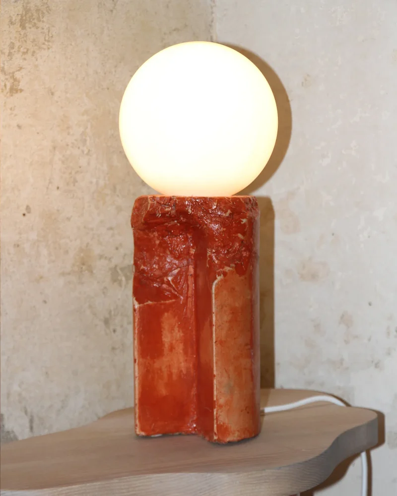 Made of a terrazzo formulated with recycled materials from the studio, this lamp was purposefully broken and re-assembled. It was then coated with natural pigments and sealed.