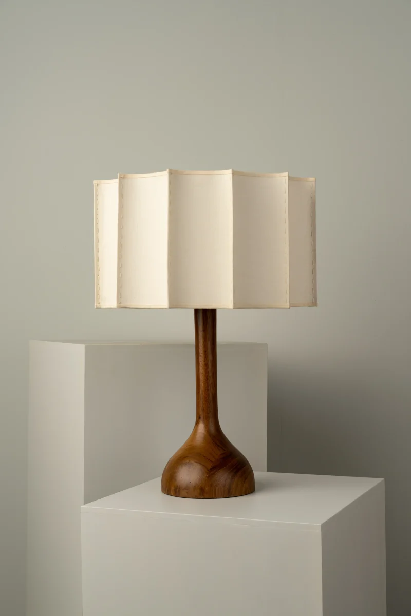 Turned parota wood base and fabric-lined lampshade with fiberglass and polystyrene.