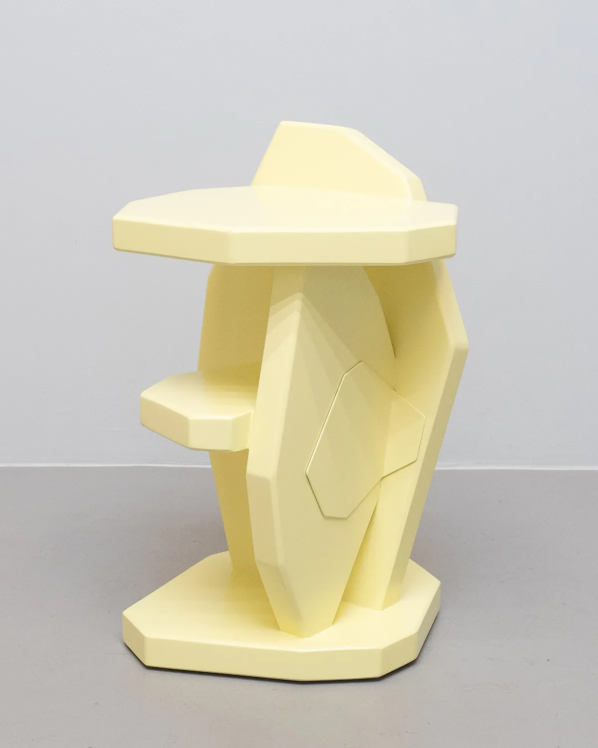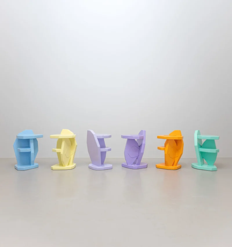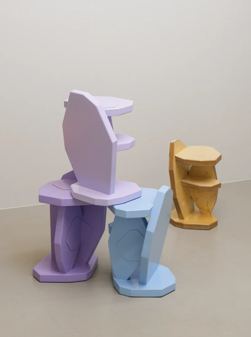 Automotive paint on birch veneer and aluminium patches. The “Patched” Side Table is a playful take on the classic side table, which can even be used as stool.