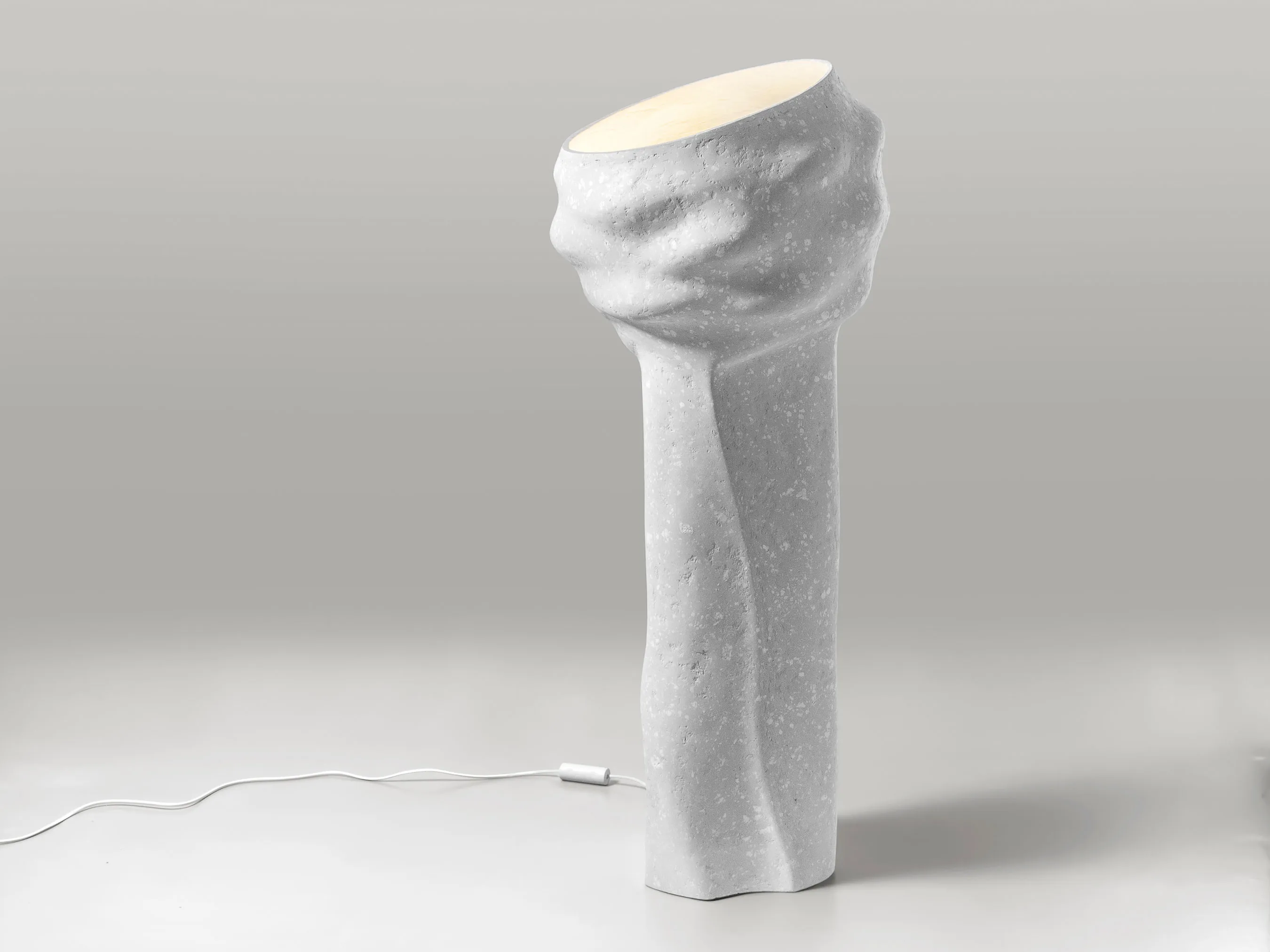 The lamp is made from a durable concrete-like composite material developed to be strong and long-lasting. Unlike brittle concrete, the material has slight elasticity, making it resistant to cracking and suitable for everyday use. Subtle surface irregularities are intentionally preserved, emphasizing material honesty rather than perfection.