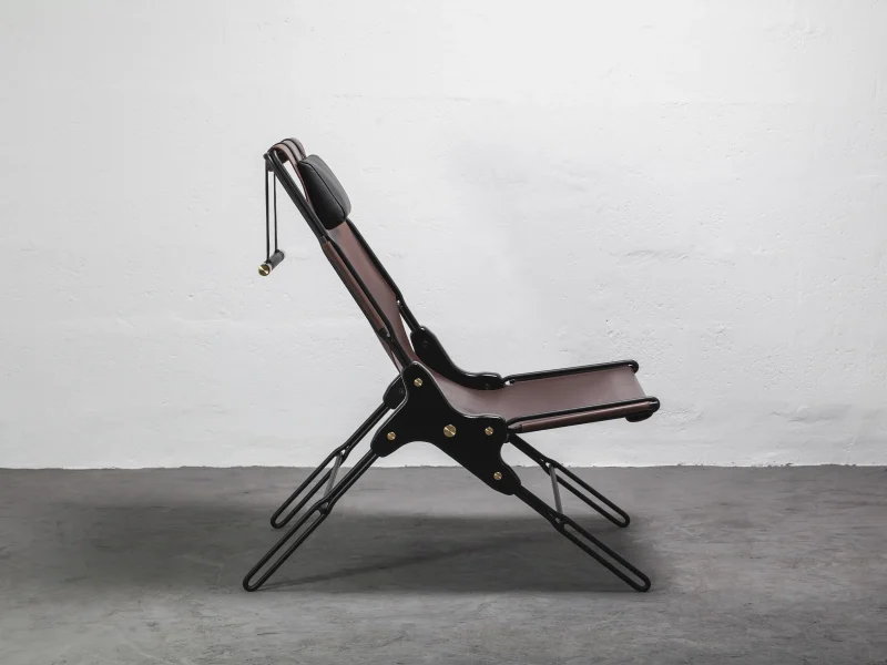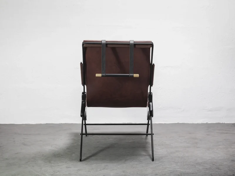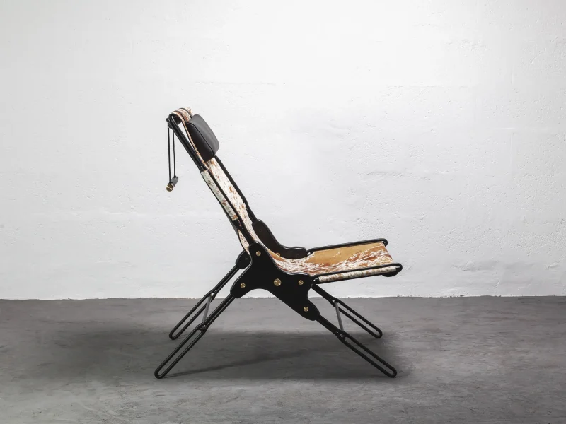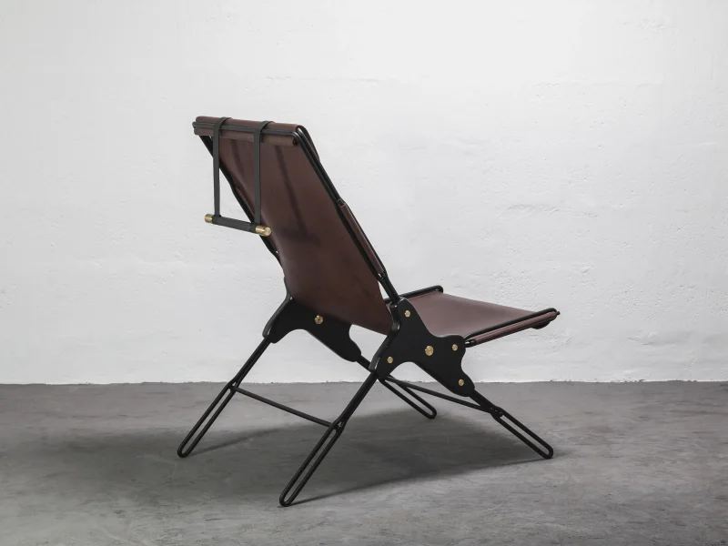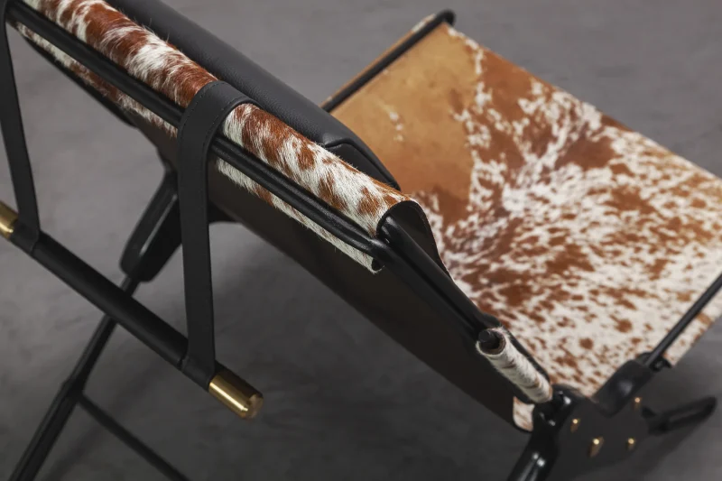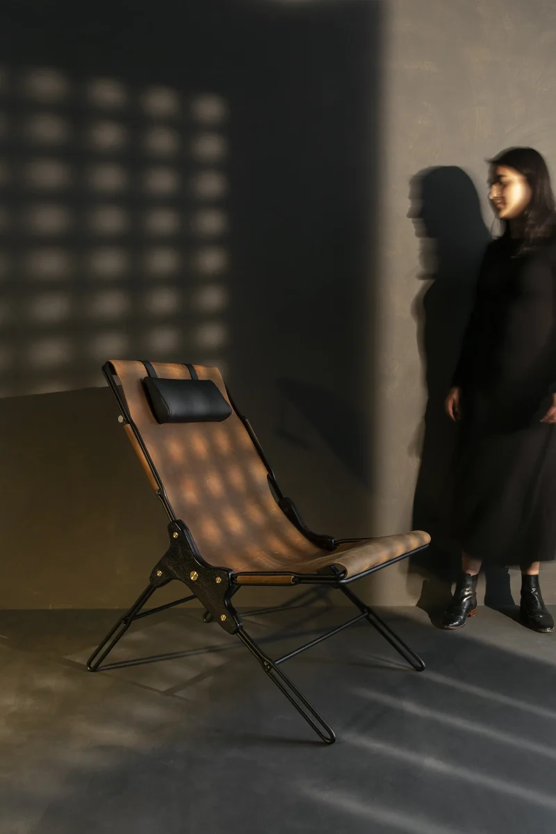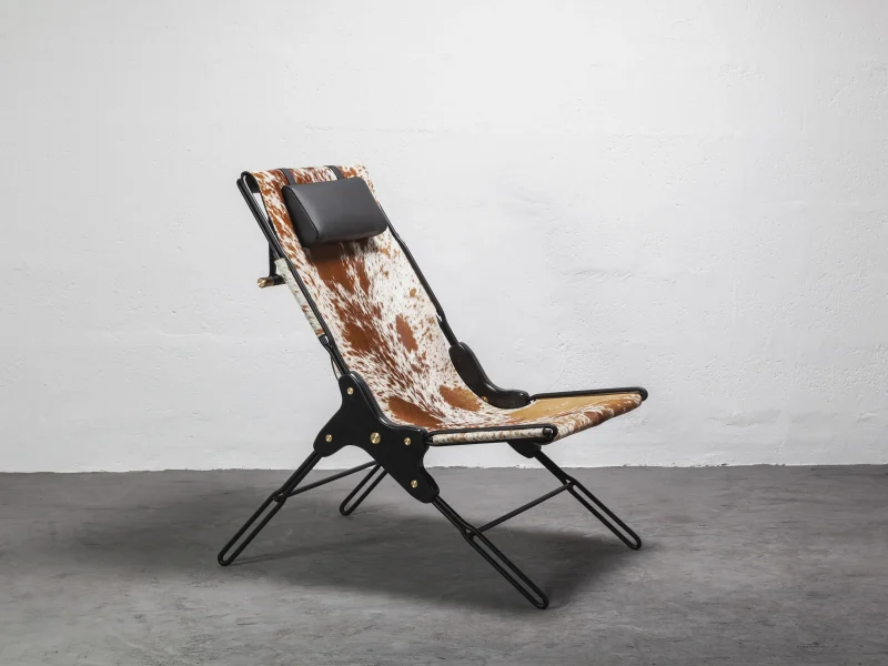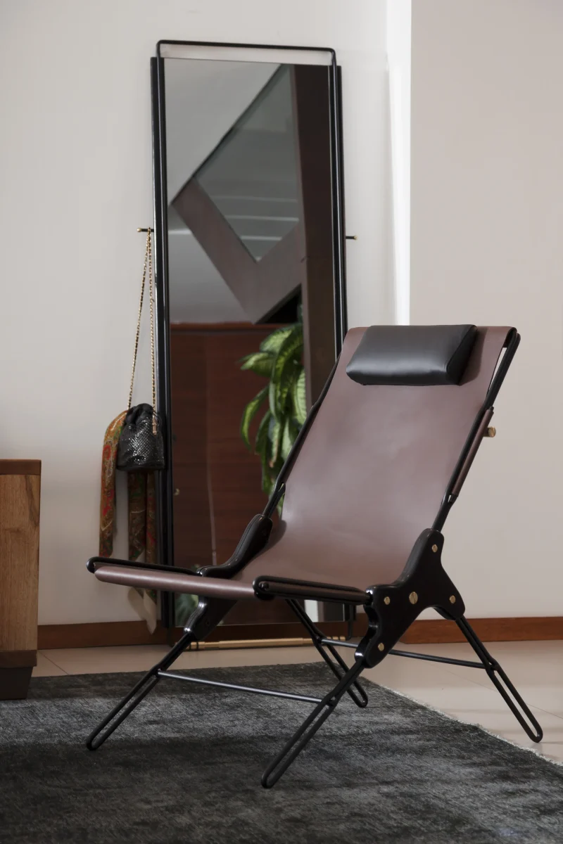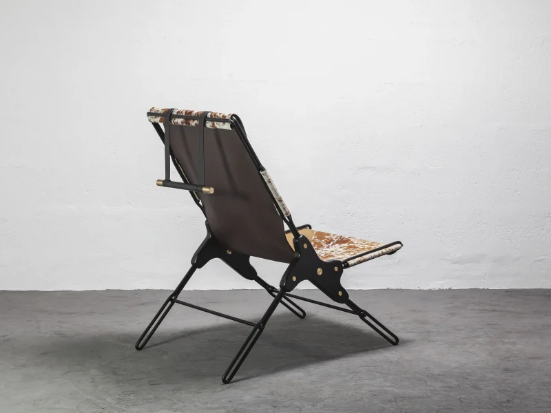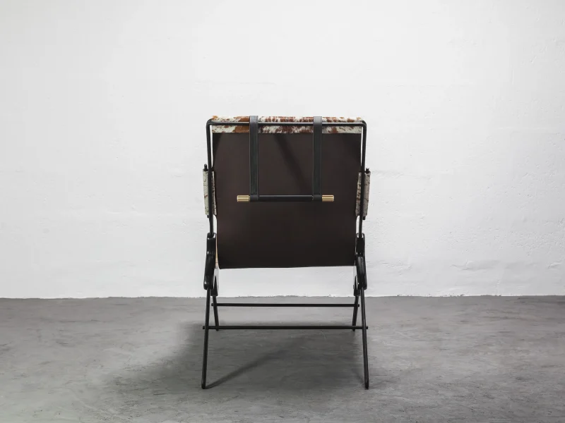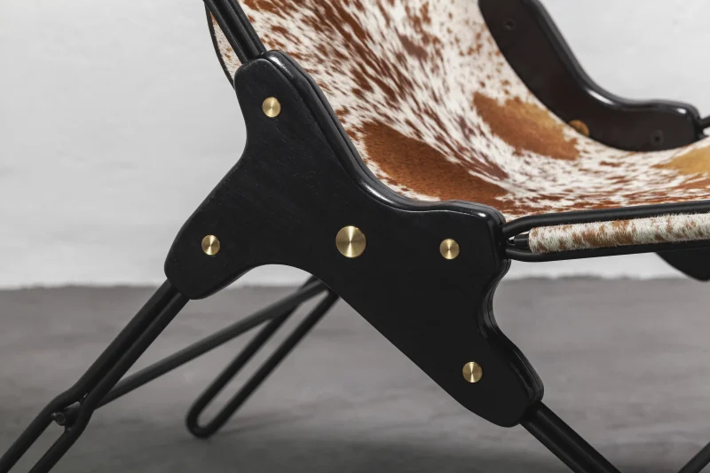 Lounge chair made of black finish steel rod structure and solid colorado wood with a natural oil finish, Ecuadorian cowhide leather seat, and lathed bronze or stainless steel hardware. Available in Olivo, Brown, and Cognac thick leather options/one-of-a-kind Pony Hair leather options. Customizations available upon request.