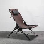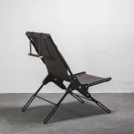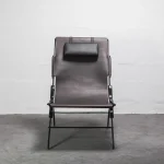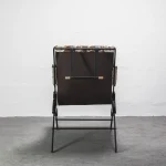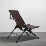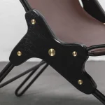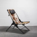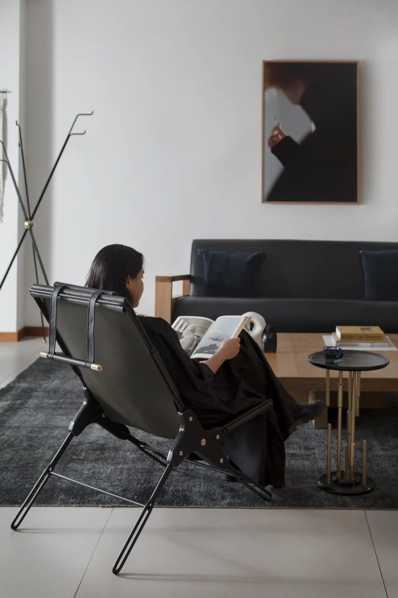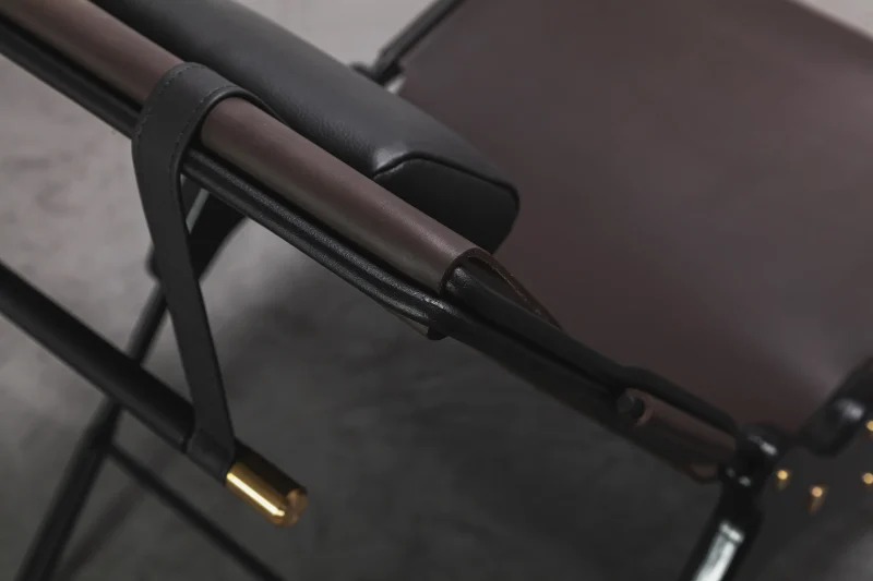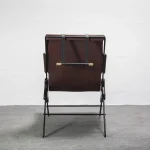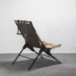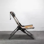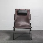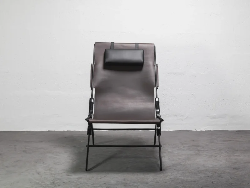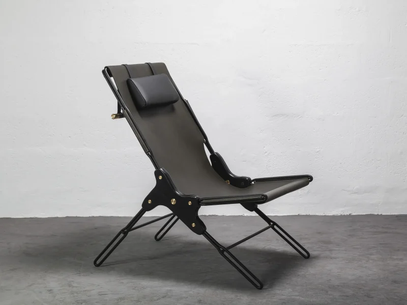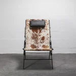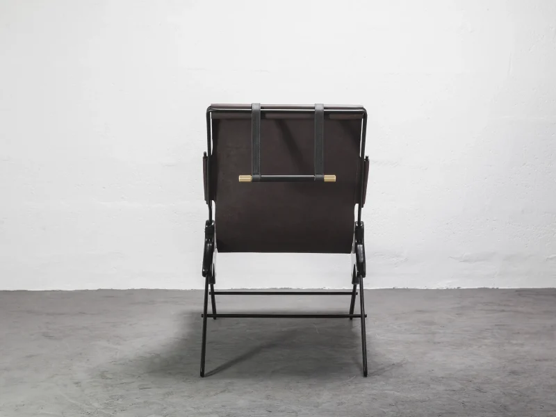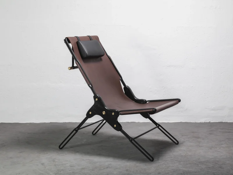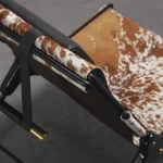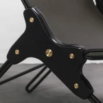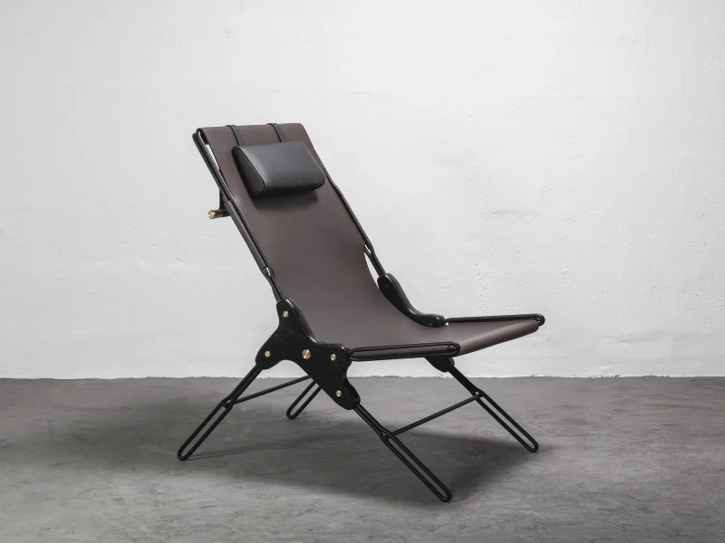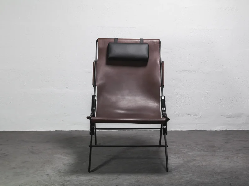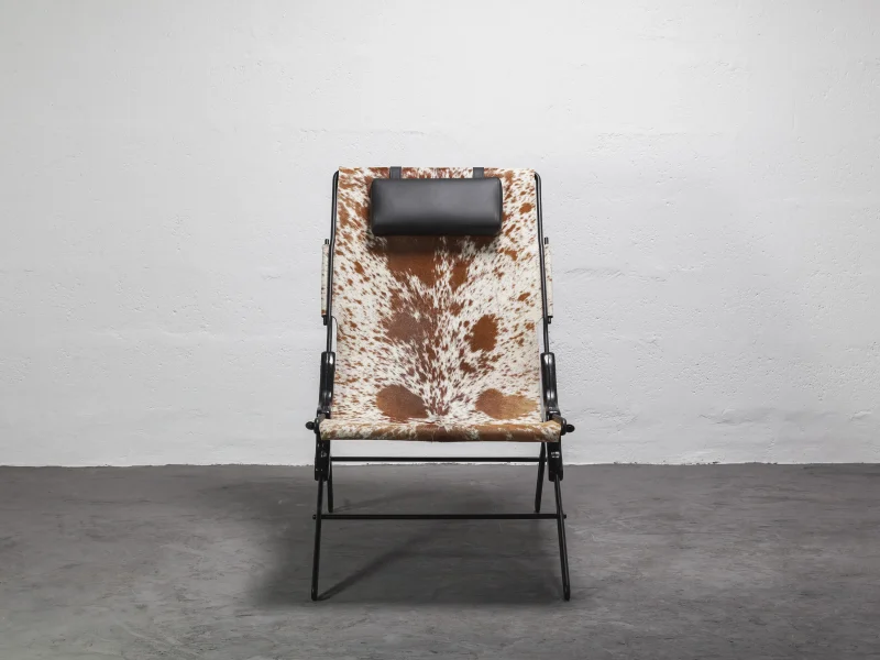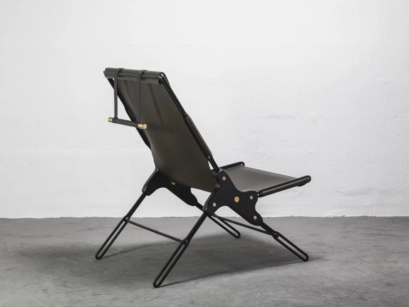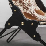 Lounge chair made of black finish steel rod structure and solid colorado wood with a natural oil finish, Ecuadorian cowhide leather seat, and lathed bronze or stainless steel hardware. Available in Olivo, Brown, and Cognac thick leather options/one-of-a-kind Pony Hair leather options. Customizations available upon request.
