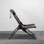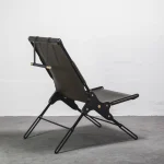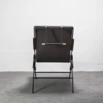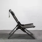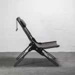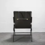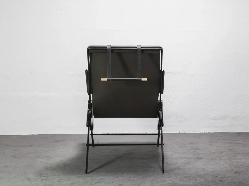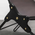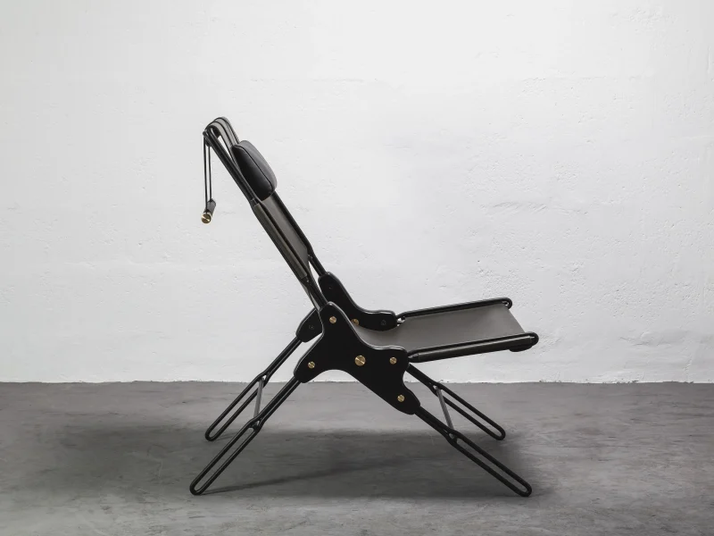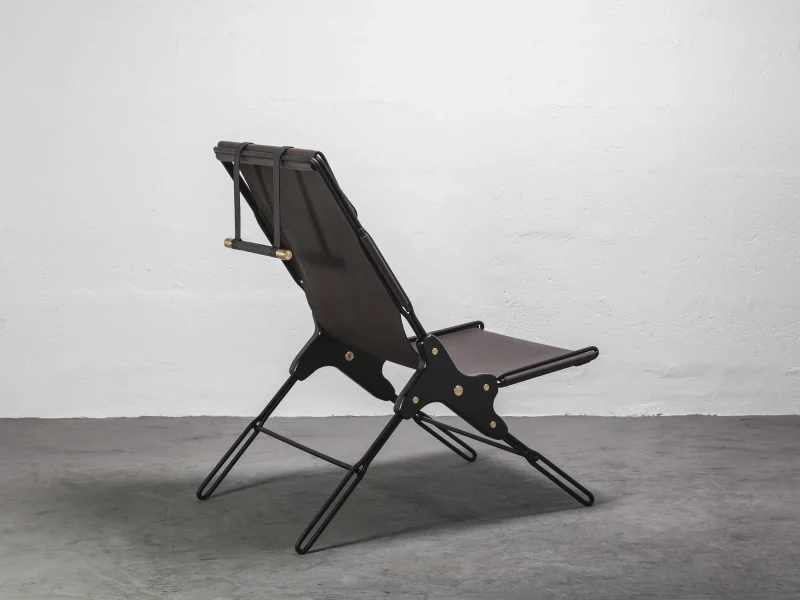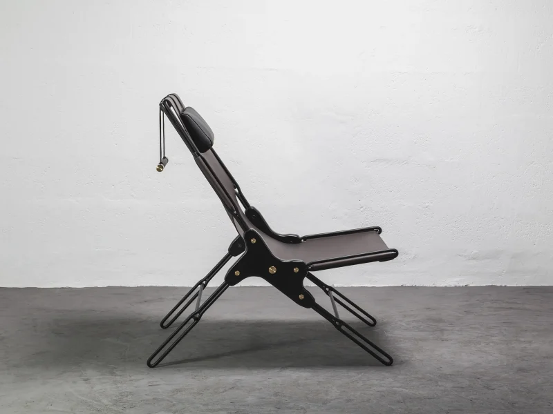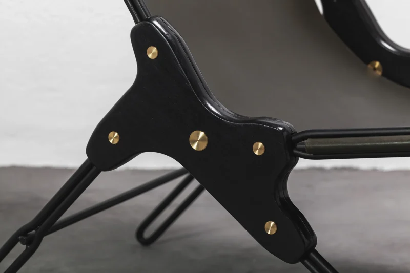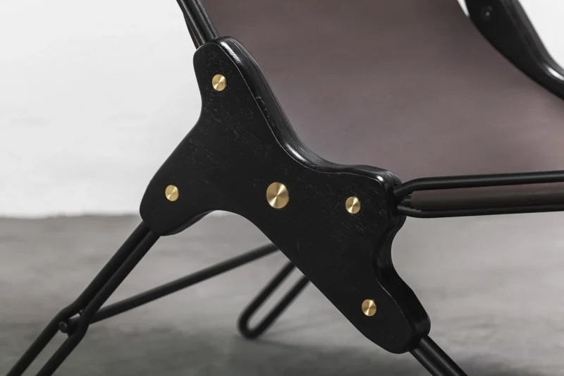 Lounge chair made of black finish steel rod structure and solid Seike wood with Ébano finish, Ecuadorian cowhide leather seat, and lathed bronze or sainless steel hardware.