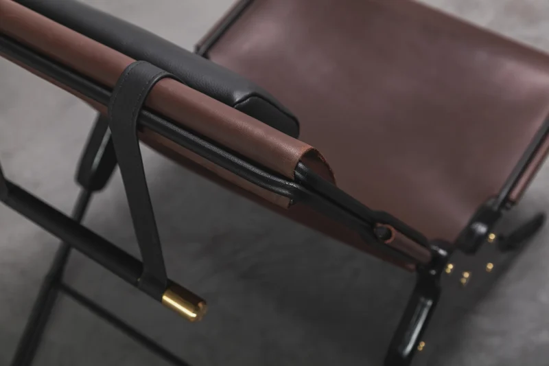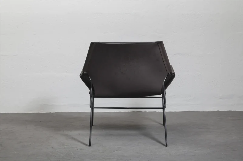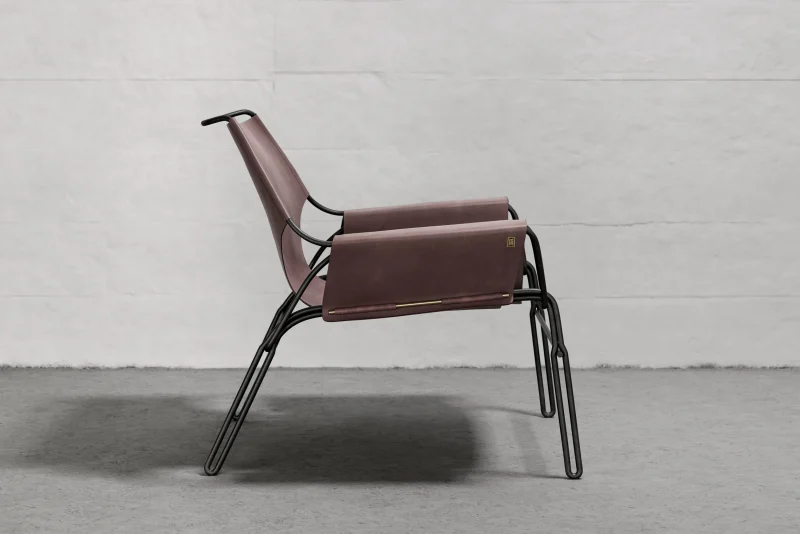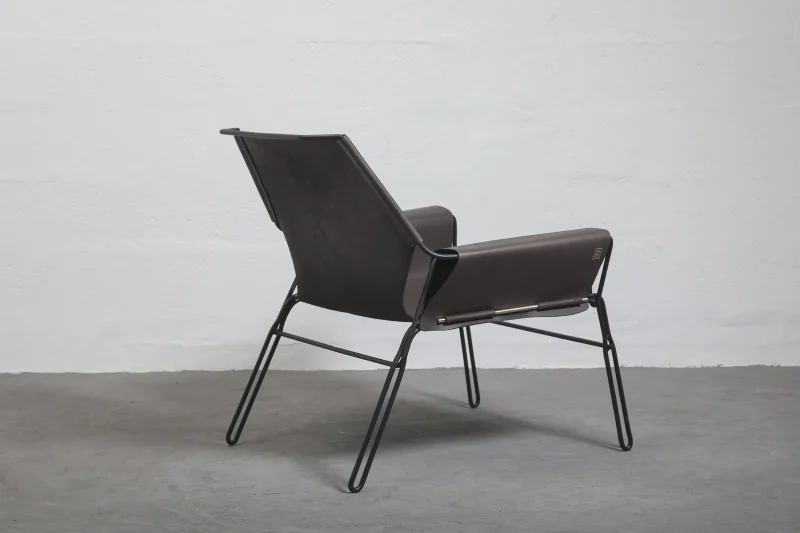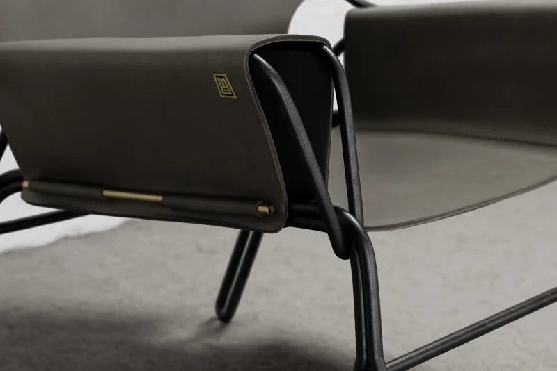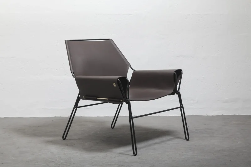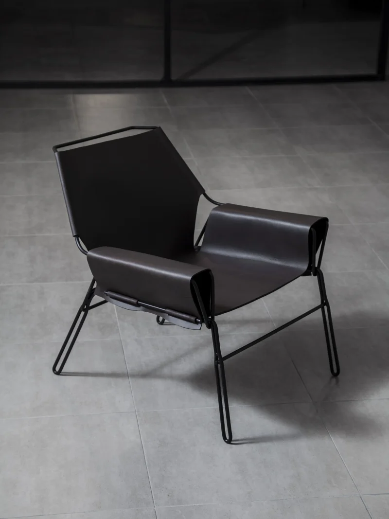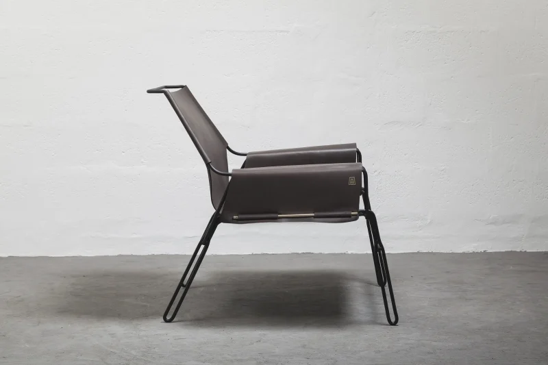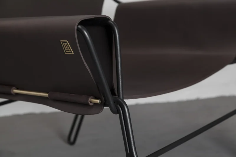 Lounge chair made of black finish steel rod structure, Ecuadorian cowhide leather seat, and lathed bronze or stainless steel hardware. Available in Olivo, Brown, and Cognac thick leather options. Customizations available upon request.