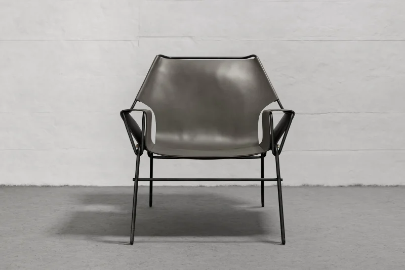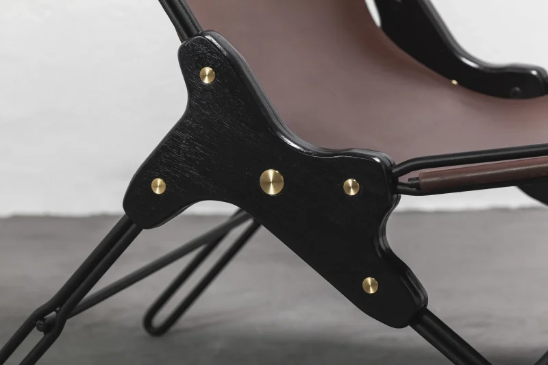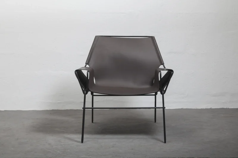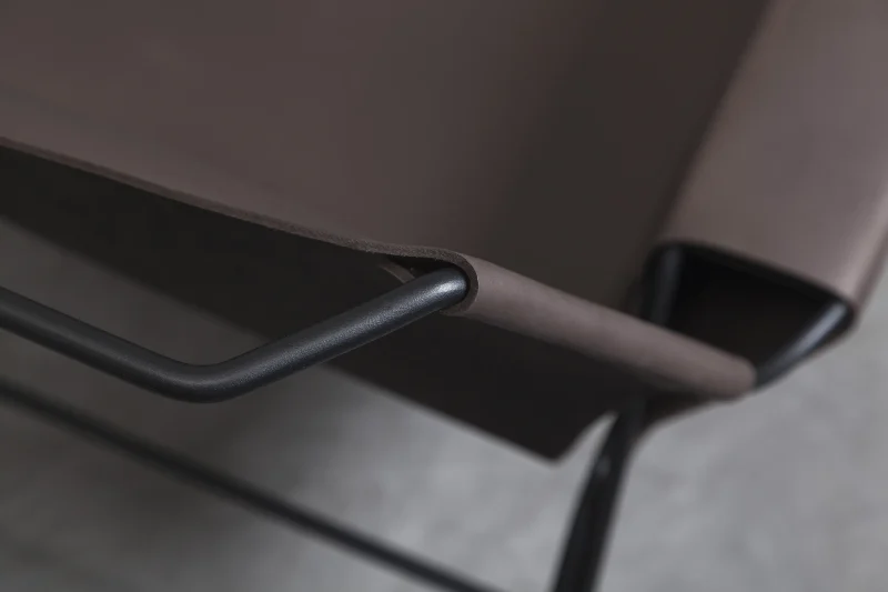 Lounge chair made of black finish steel rod structure, Ecuadorian cowhide leather seat, and lathed bronze or stainless steel hardware.