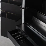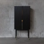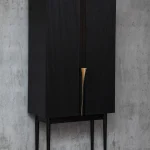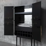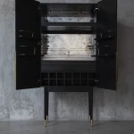 Bar cabinet made of solid seike wood body with Ébano finish, details in lathed bronze, interior surfaces laminated with stainless steel sheets, interior back panel with antique mirror glass, and bronze sand-casted handles.