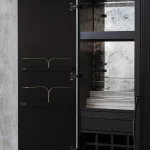 Bar cabinet made of solid Seike wood body with Ébano finish, details in lathed bronze, interior surfaces laminated with stainless steel sheets, interior back panel with antique mirror glass, and bronz