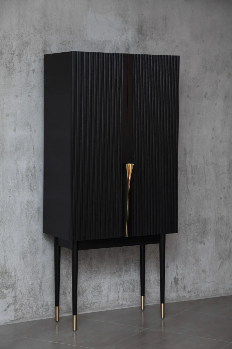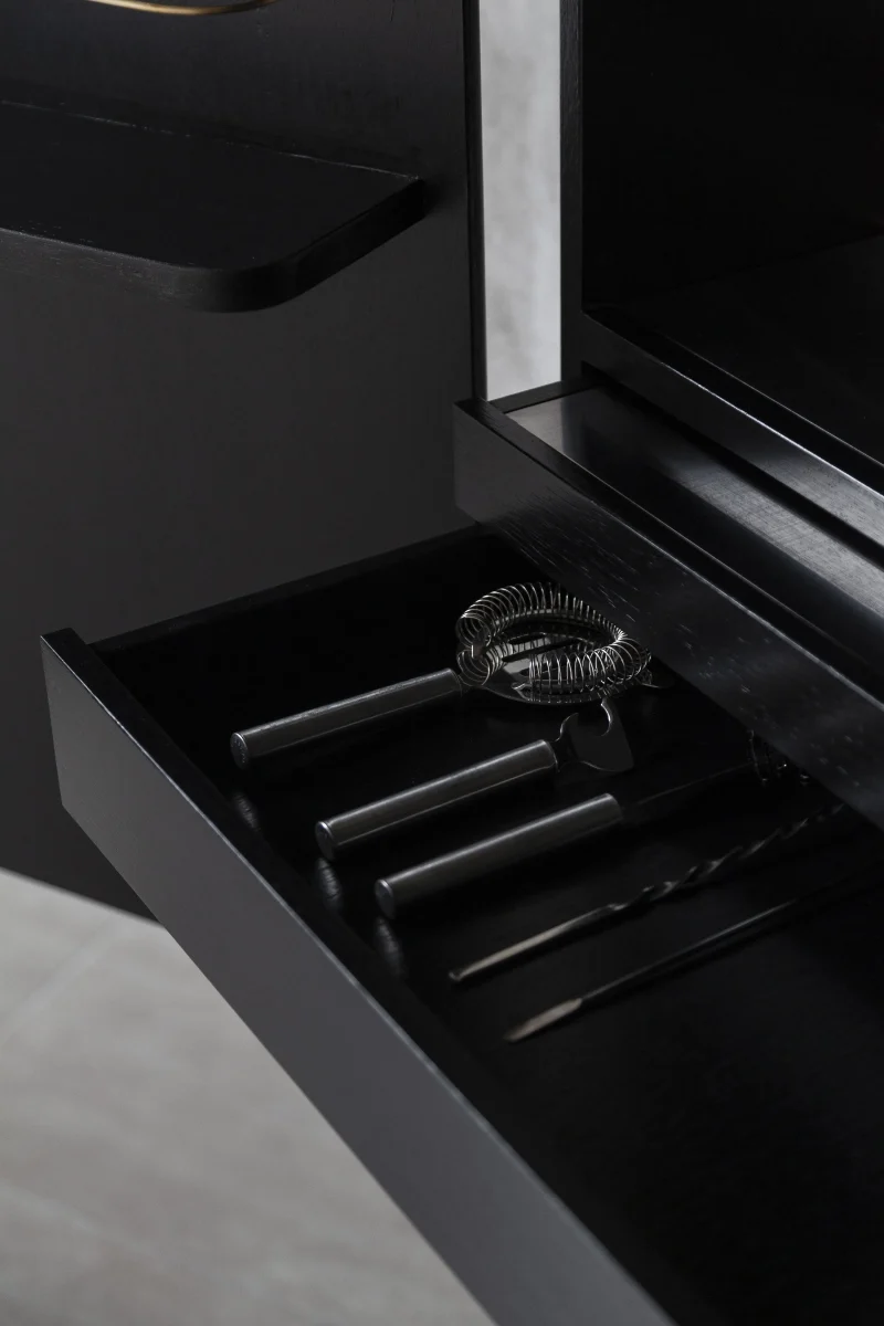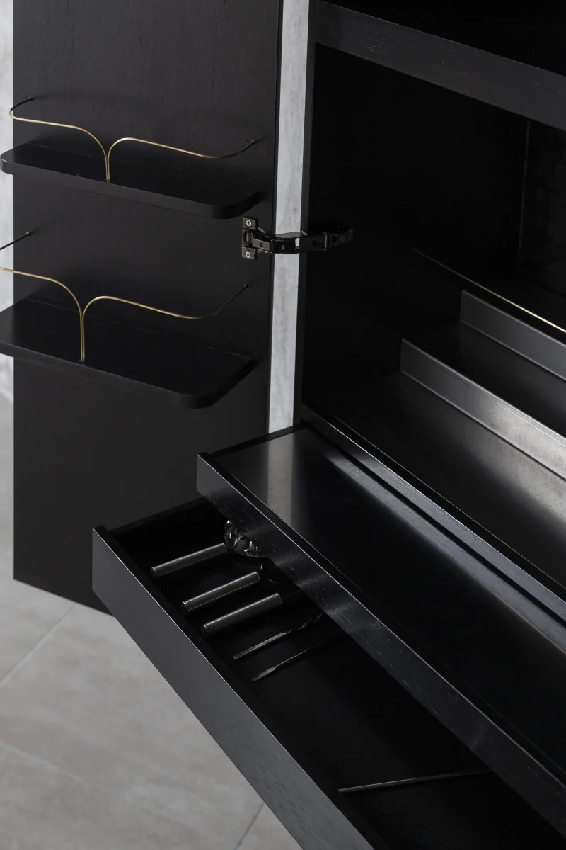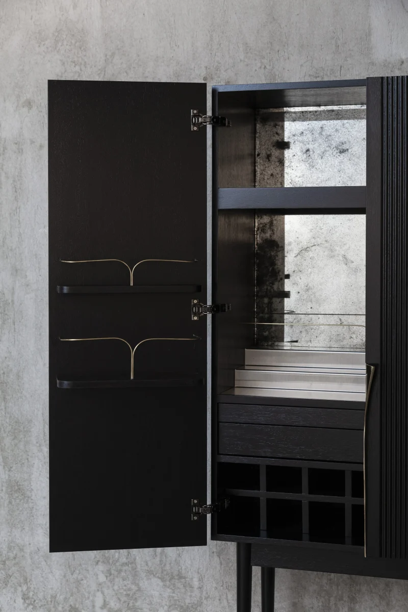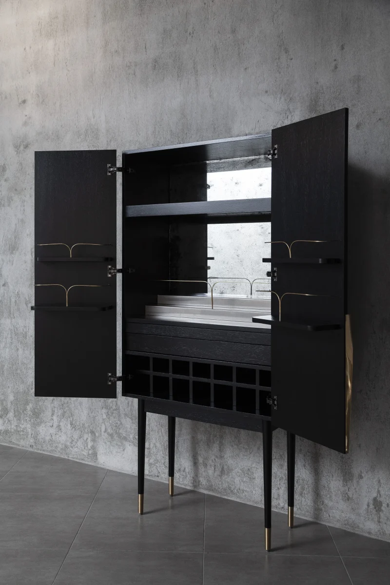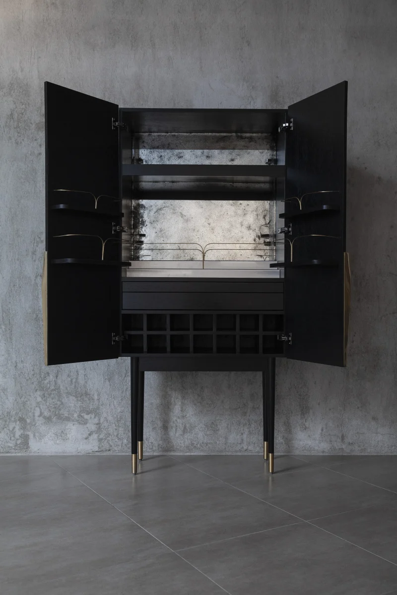 Bar cabinet made of solid seike wood body with Ébano finish, details in lathed bronze, interior surfaces laminated with stainless steel sheets, interior back panel with antique mirror glass, and bronze sand-casted handles.