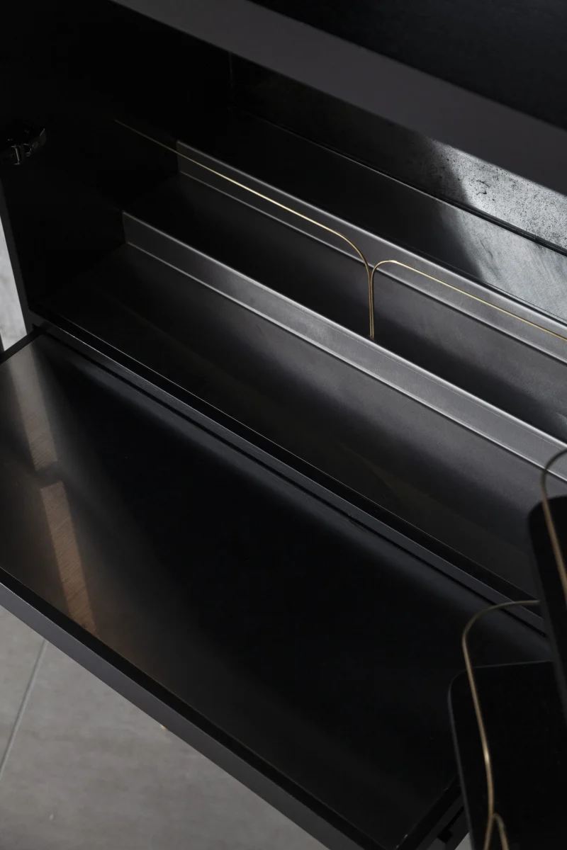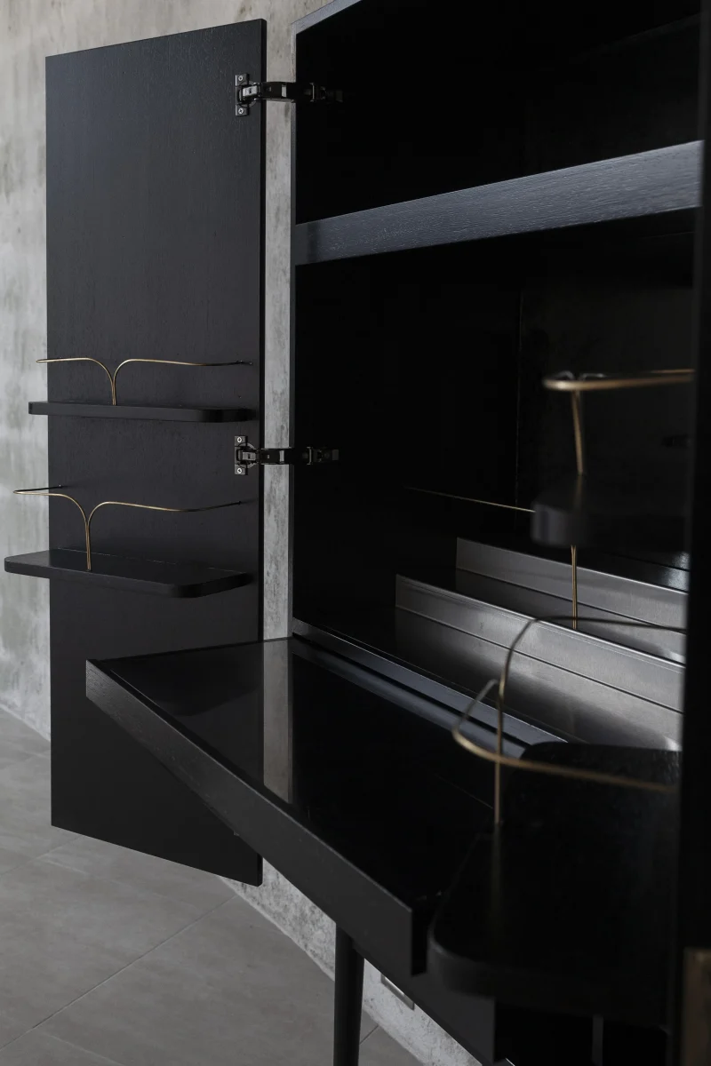 Bar cabinet made of solid Seike wood body with Ébano finish, details in lathed bronze, interior surfaces laminated with stainless steel sheets, interior back panel with antique mirror glass, and bronz