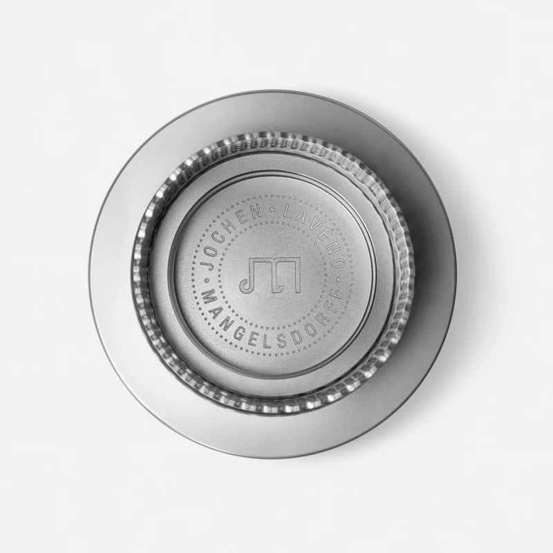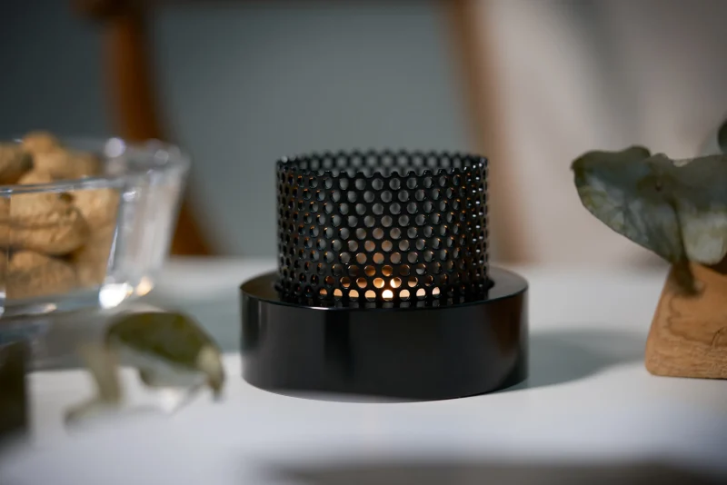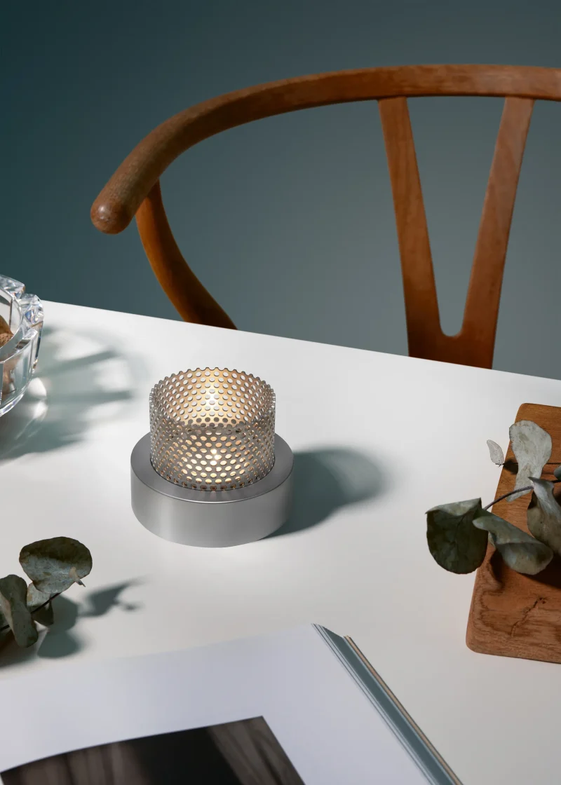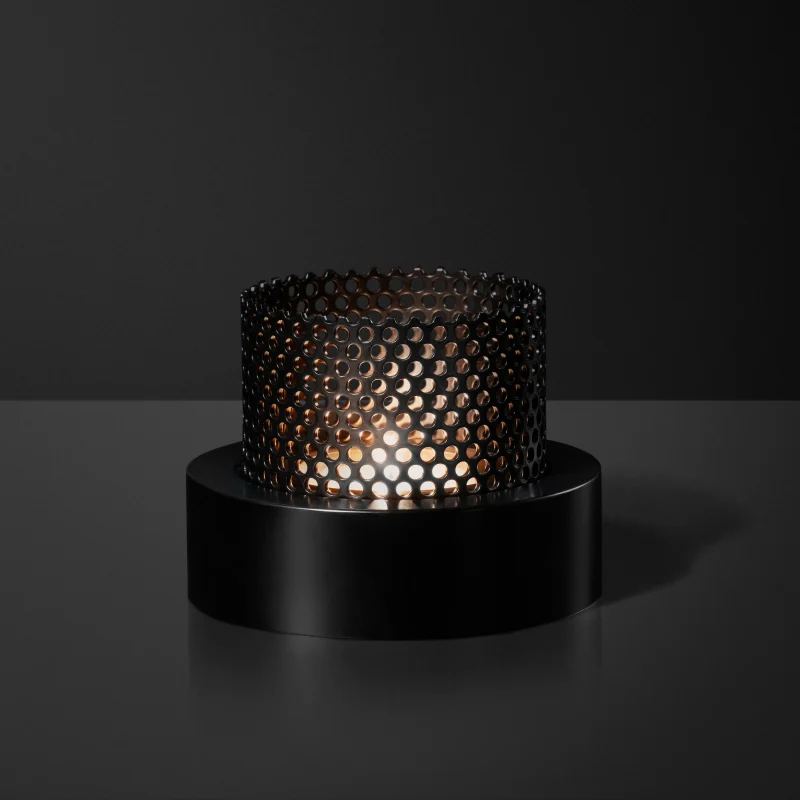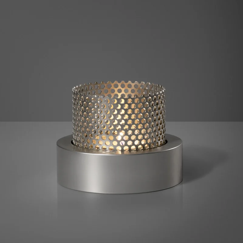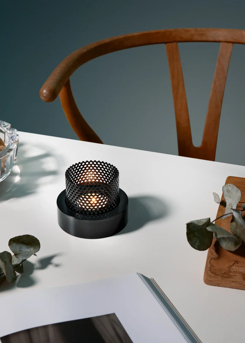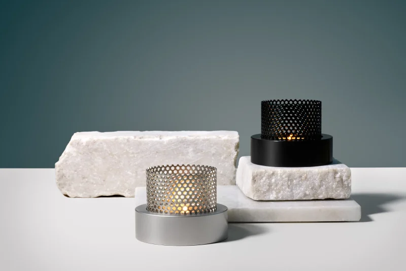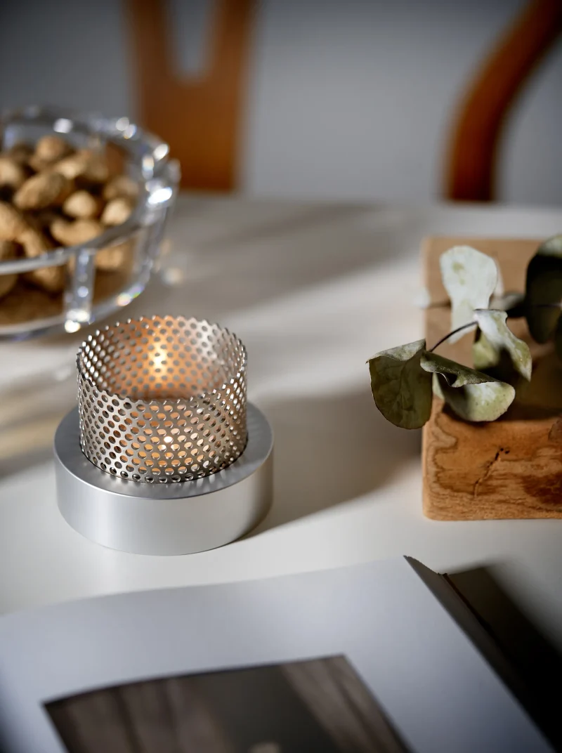 Perform is a solid metal candle holder in two parts, a CNC-milled base in aluminium and a perforated steel tube made in a factory in Sweden