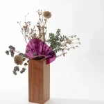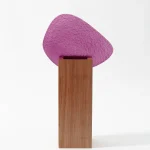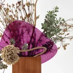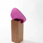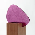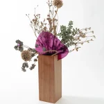 The technical exploration of fusing glass was the starting point of the creation of Permeio vases. The textured and colored glass has an organic shape that rests in a solid wood shape, dividing the piece and creating the contrast between stiffness and fluidity. The position of the arrangements in relation to the glass, in front or behind, brings different perspectives of the distorted image that permeates the textured and translucent surface. All the pieces receive a glass vase in its interior, allowing for wet or dry floral arrangements.