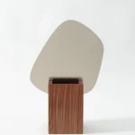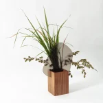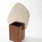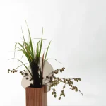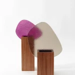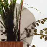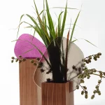 The technical exploration of fusing glass was the starting point of the creation of Permeio vases. The textured and colored glass has an organic shape that rests in a solid wood shape, dividing the piece and creating the contrast between stiffness and fluidity. The position of the arrangements in relation to the glass, in front or behind, brings different perspectives of the distorted image that permeates the textured and translucent surface. All the pieces receive a glass vase in its interior, allowing for wet or dry floral arrangements.