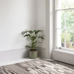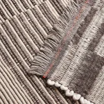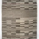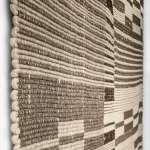 A one-of-a-kind piece made with two warps of natural undyed British wool in the shades of whites, greys, and Welsh black, and a natural undyed chunky British wool weft with coloured details of silk made out of waste Indian saris. It celebrates a classic bold weave in a distorted graphic pattern, created by alternatively using the two warps and short tassels on both sides.
