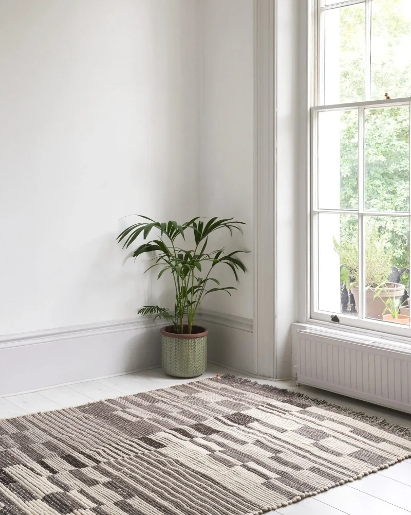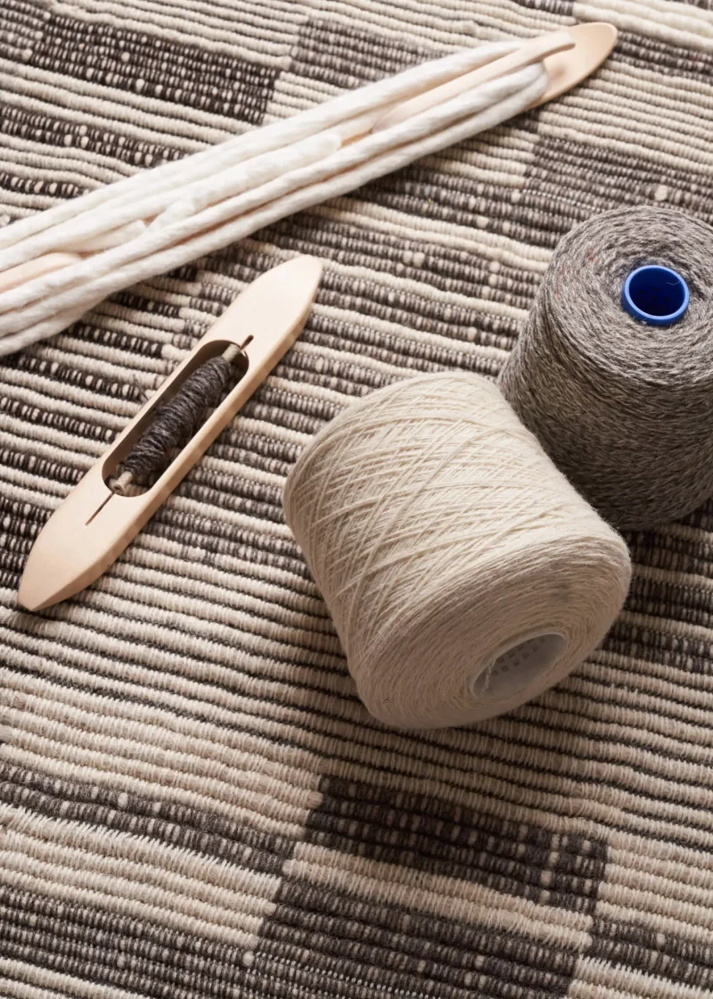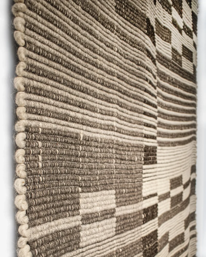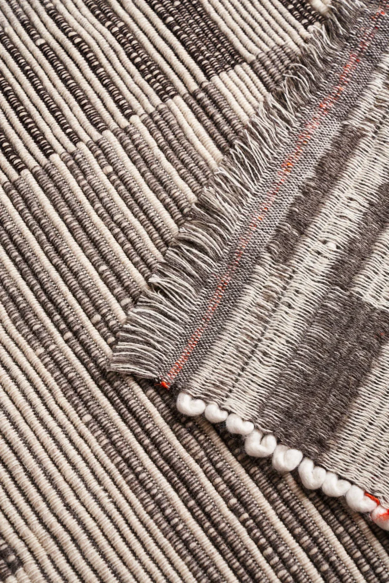 A one-of-a-kind piece made with two warps of natural undyed British wool in the shades of whites, greys, and Welsh black, and a natural undyed chunky British wool weft with coloured details of silk made out of waste Indian saris. It celebrates a classic bold weave in a distorted graphic pattern, created by alternatively using the two warps and short tassels on both sides.