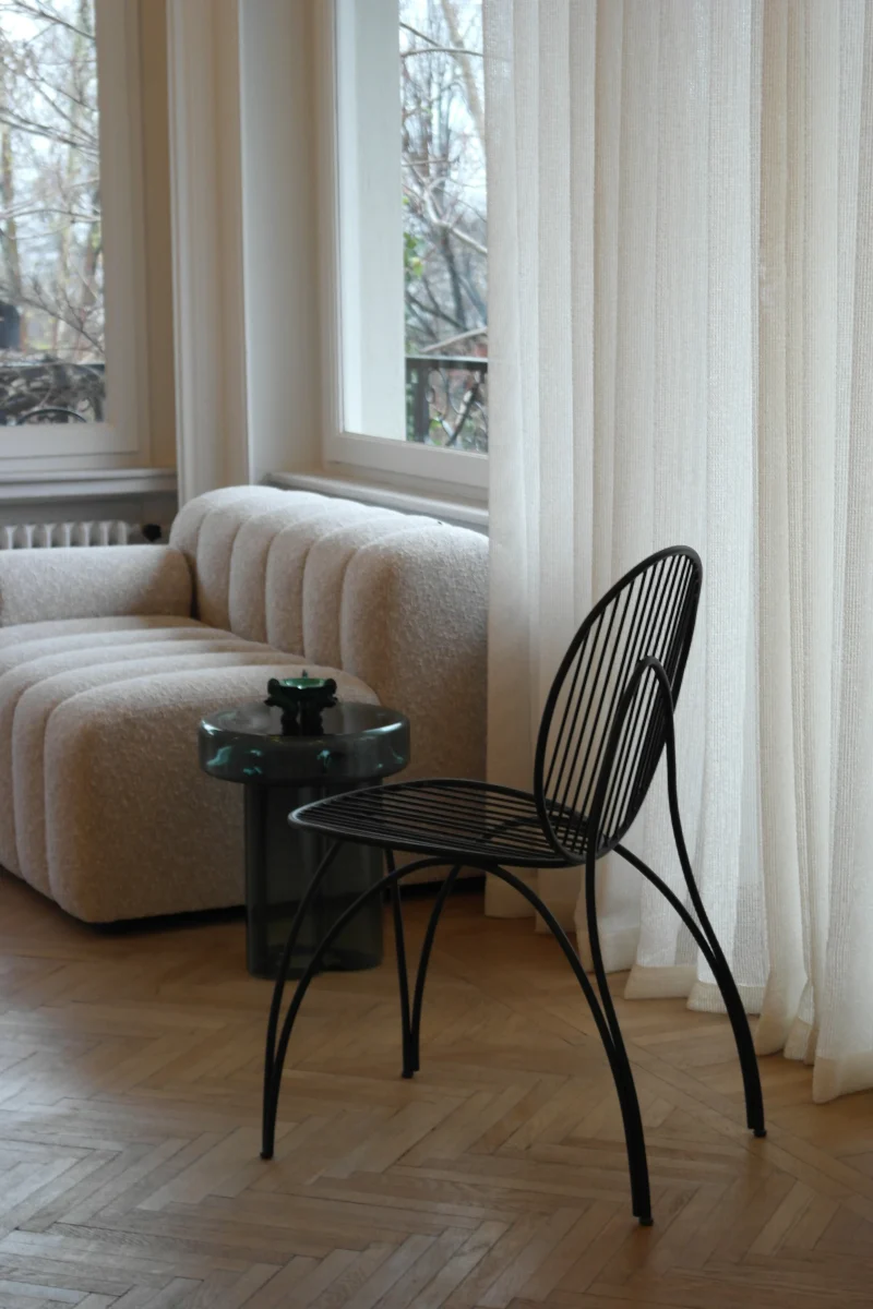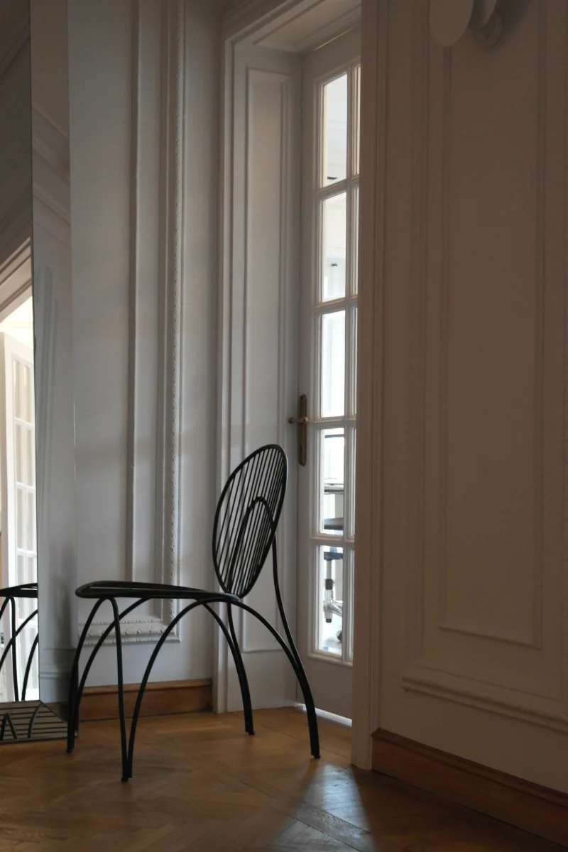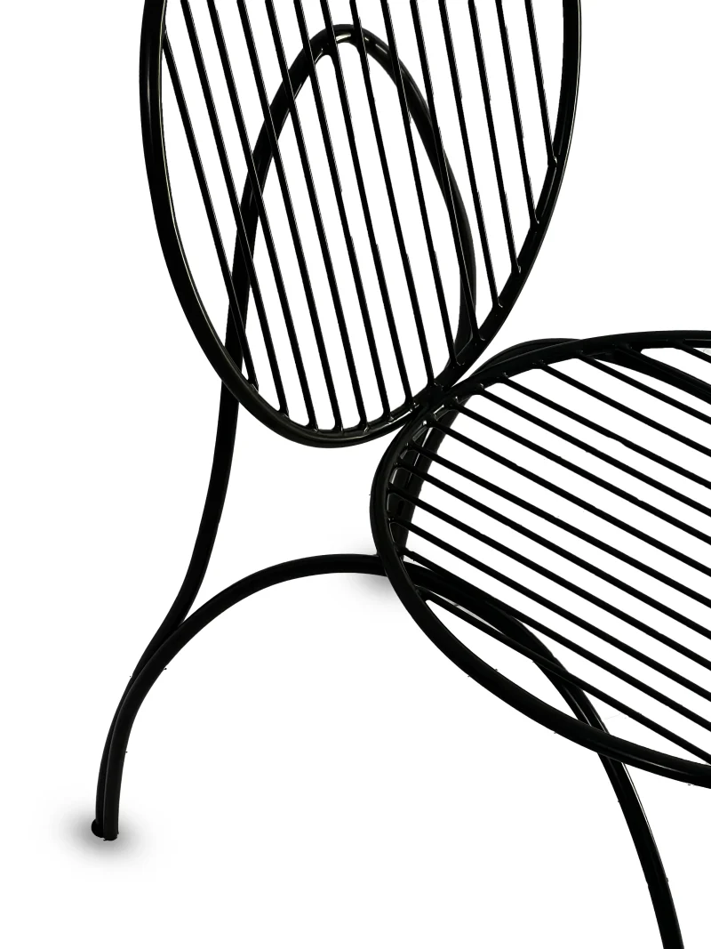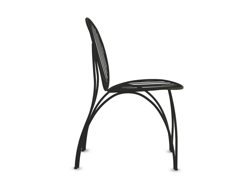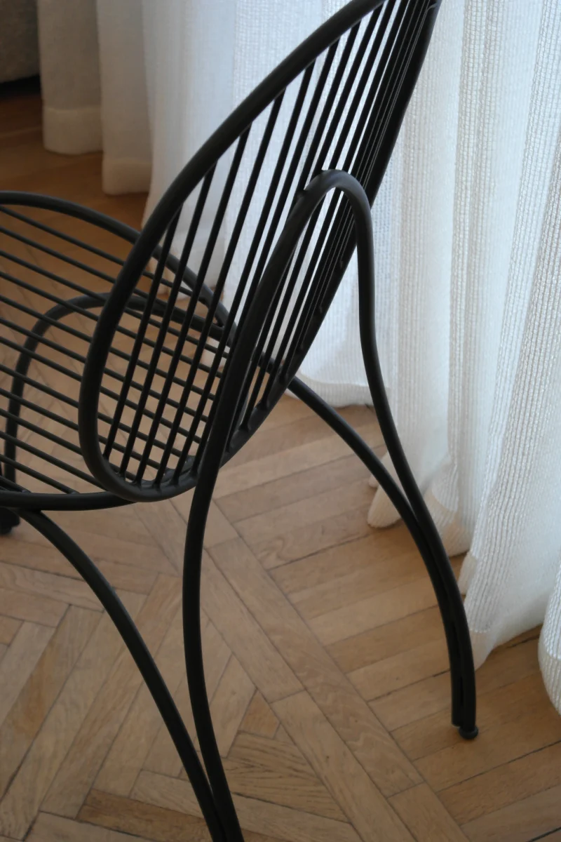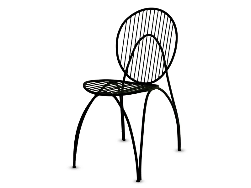 The chair features thin metal rods moulded to merge into a solid, supportive base.