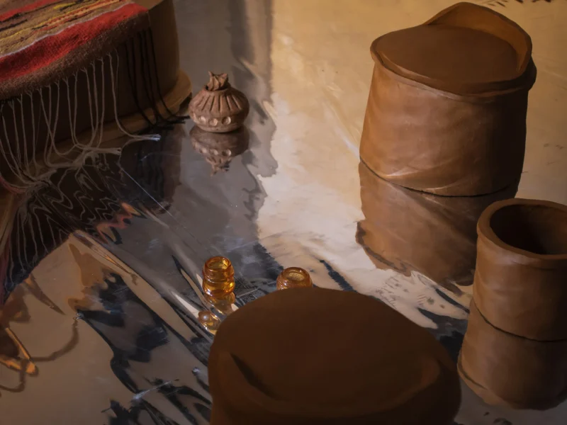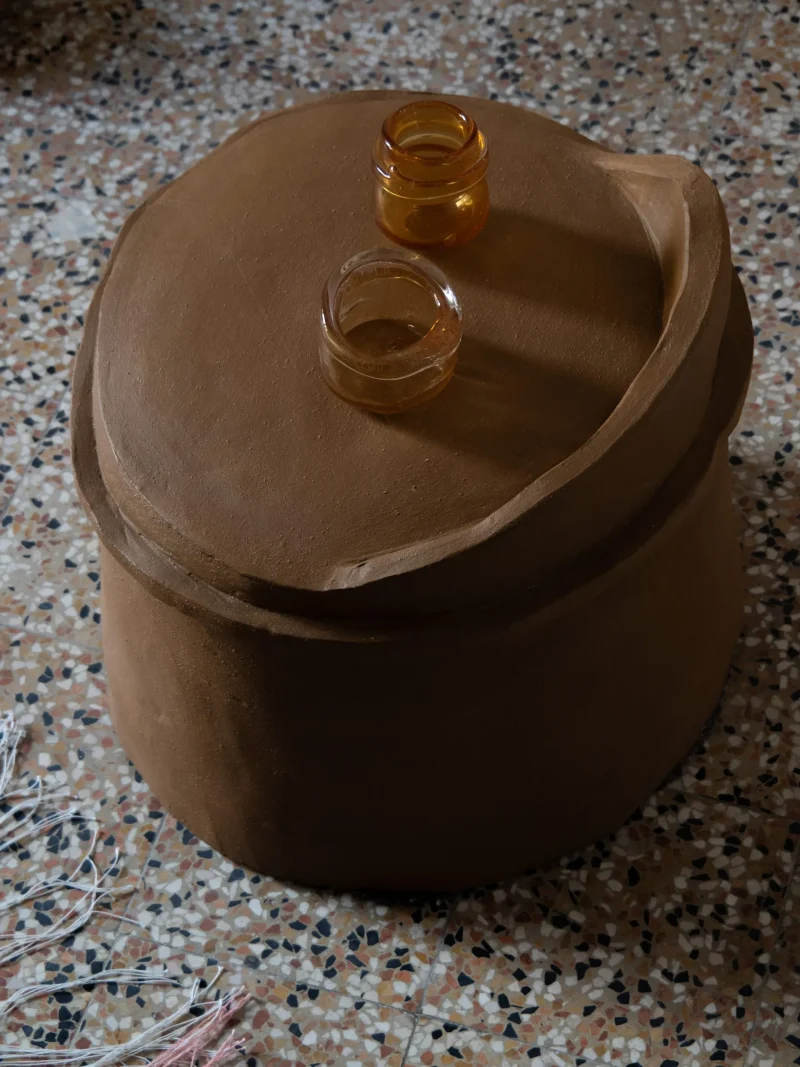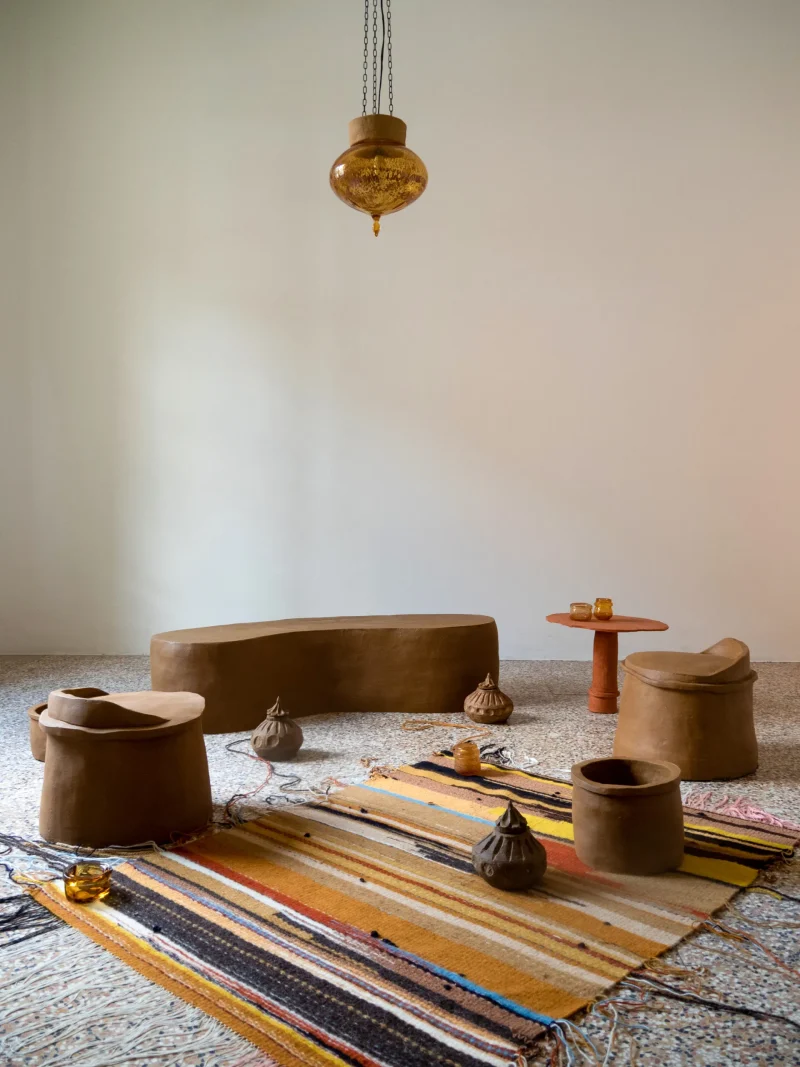 Inspired by the Mediterranean, by the Maghreb Ksar, with seats made entirely of raw land, natural oils, and waxes. They are a metaphor and abstraction of the typical Moroccan collective dwellings, in which spaces – or even entire buildings – were provided for community life.