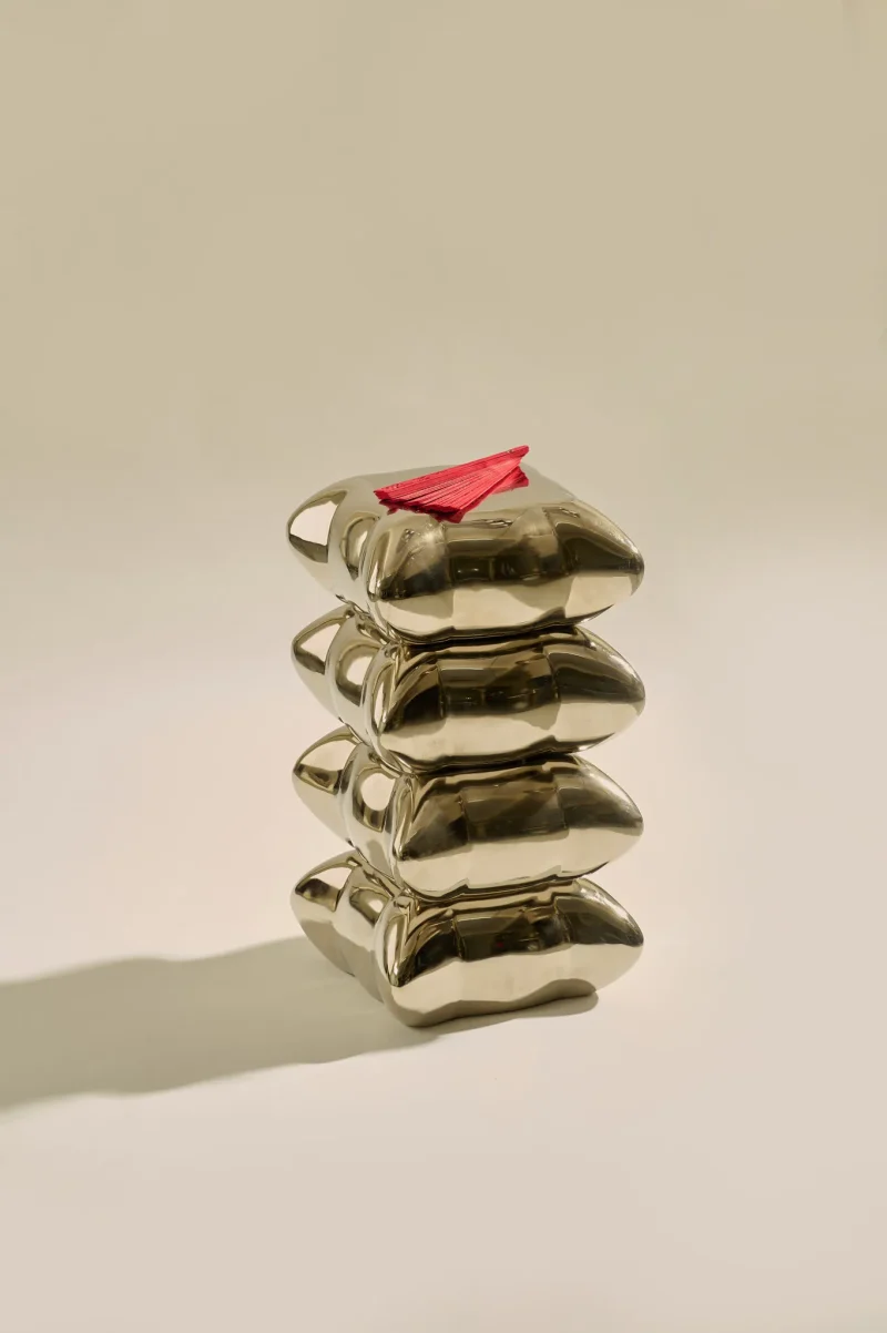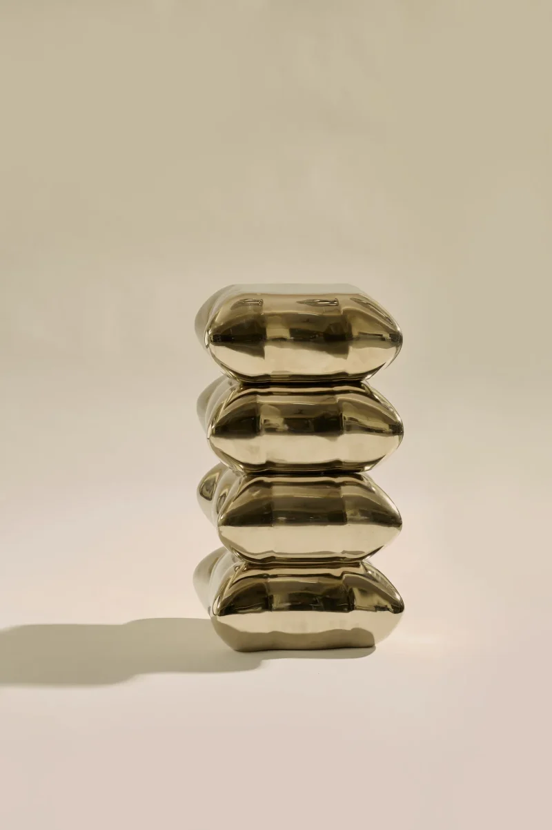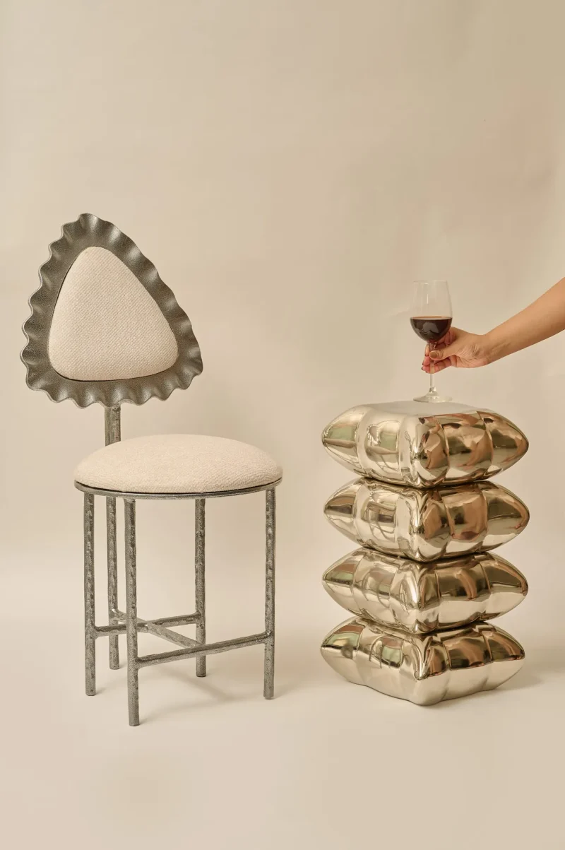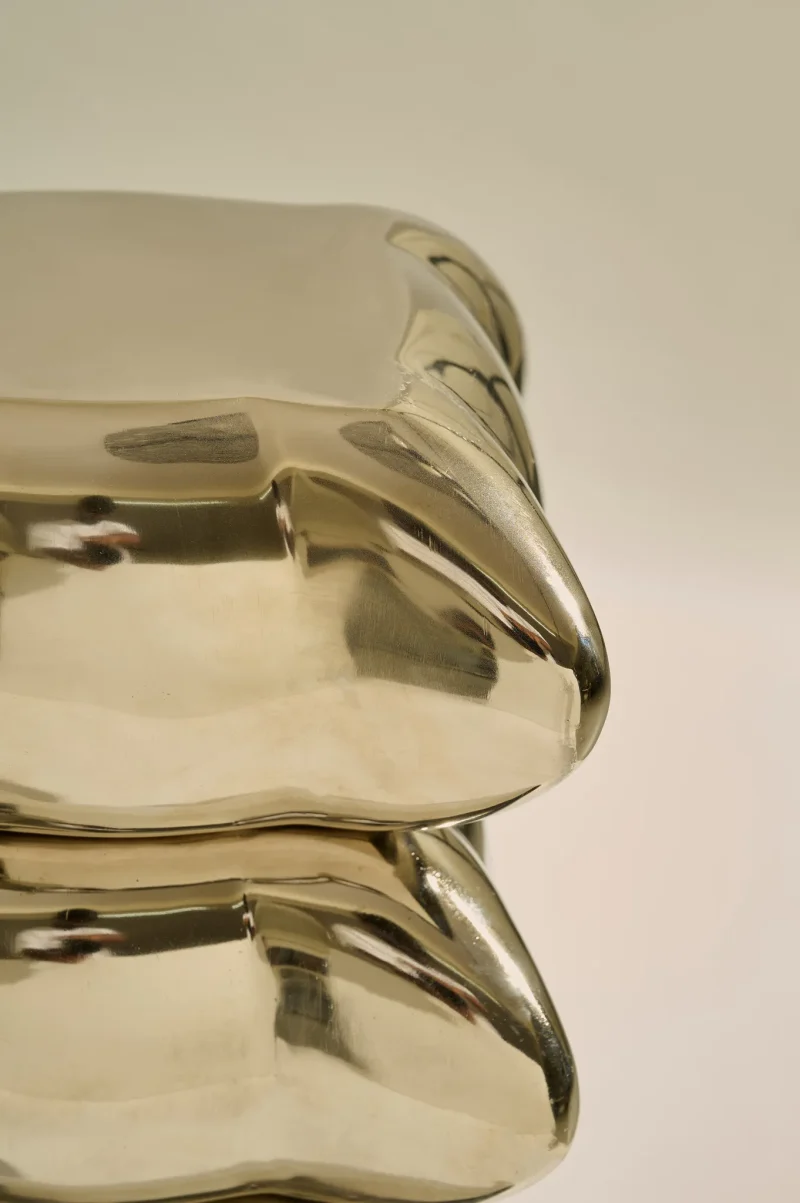 Inspired by the gentle embrace of a pillow, this unique piece features a series of individually cast aluminum cushions, meticulously stacked and finished in a luxurious nickel plating. The highly reflective surface and sculptural form create a dynamic interplay of light and shadow, making it a focal point in any room. A chic side table for your drinks, or a standalone artistic element, it offers both unparalleled style and utility. Its sturdy construction ensures durability while its distinctive aesthetic commands attention.