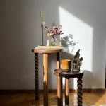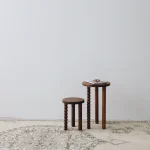 Euclidean geometry -little sphere- is selected for the turned wood leg in order to bring an appealing look to the lower part of the side table. Dark walnut polishing over traditional beech wood is a flat look for the users and avoids the furniture during dense harm and scoring.
