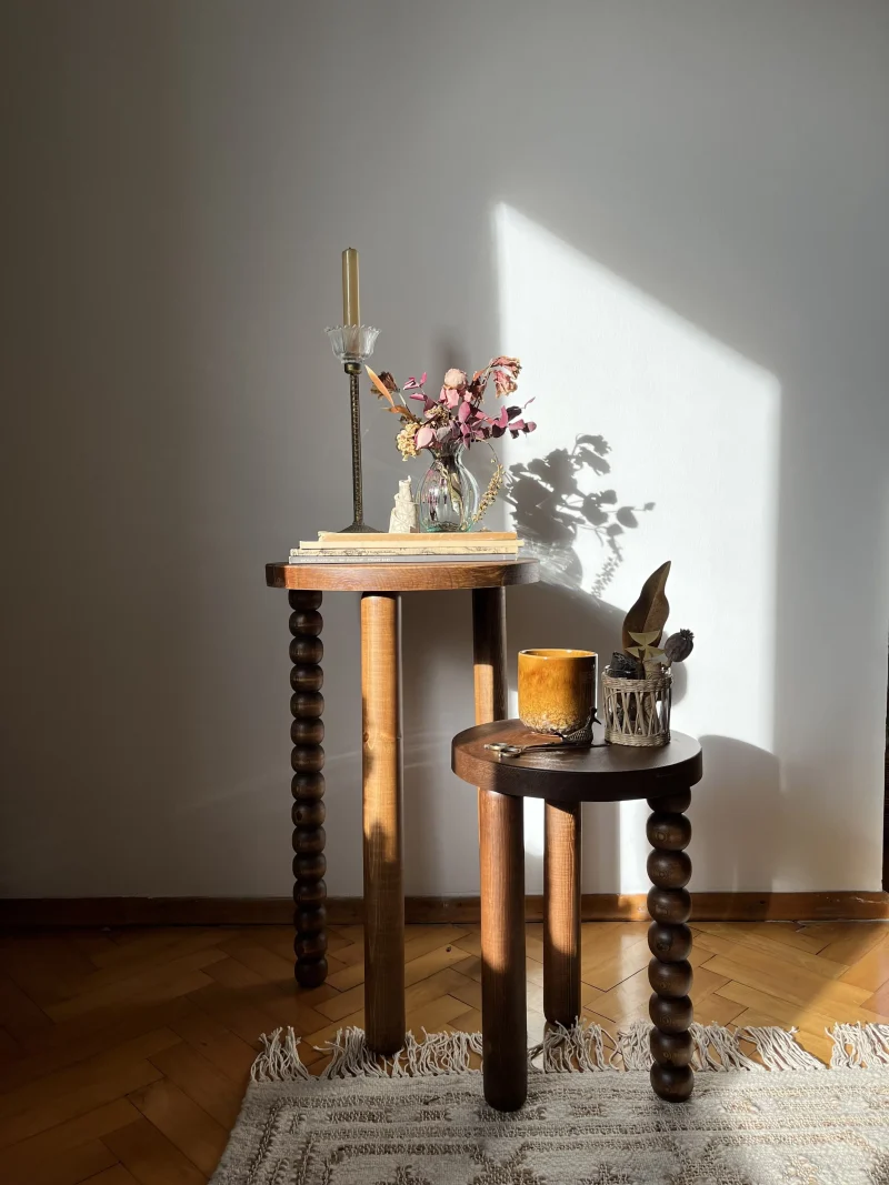 Euclidean geometry -little sphere- is selected for the turned wood leg in order to bring an appealing look to the lower part of the side table. Dark walnut polishing over traditional beech wood is a flat look for the users and avoids the furniture during dense harm and scoring.