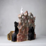 Gábor Góbi hand carved this candle holder with different repurposed wood and remnants of pristine pink marble. The pine is enhanced using the traditional Japanese Yakisugi method, transforming and enhancing the material, and it’s then elegantly finished with natural oils and sealed with beeswax.