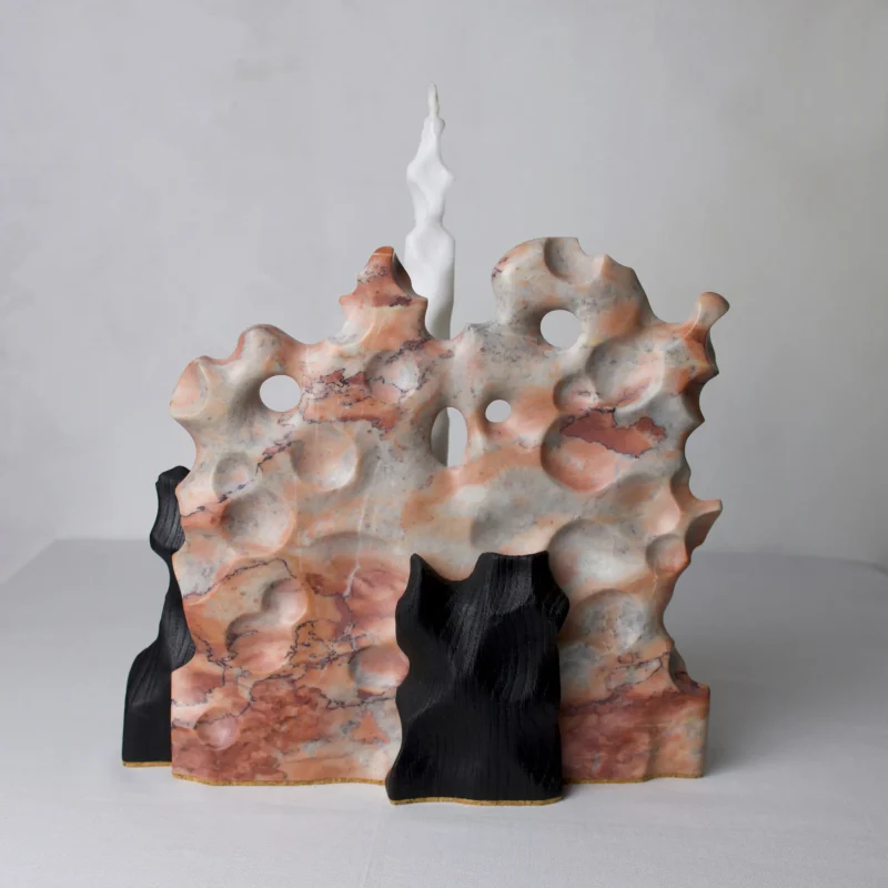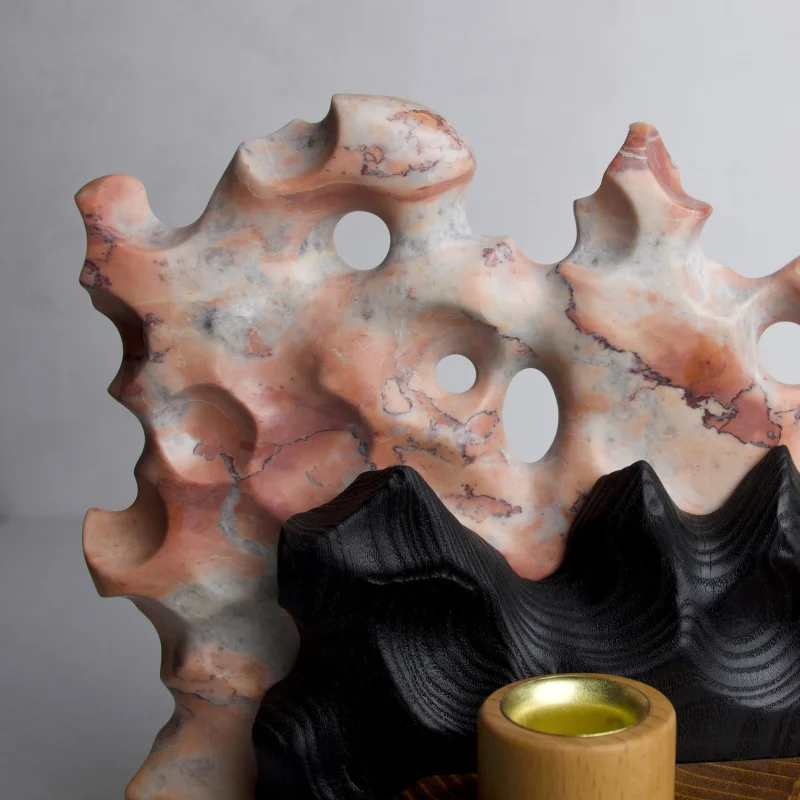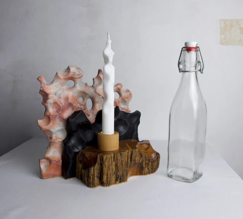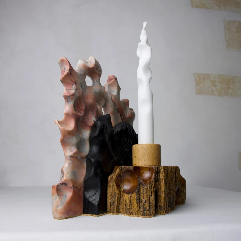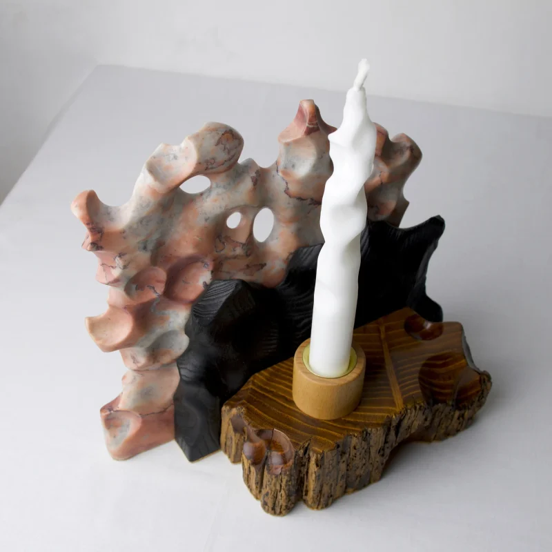 Gábor Góbi hand carved this candle holder with different repurposed wood and remnants of pristine pink marble. The pine is enhanced using the traditional Japanese Yakisugi method, transforming and enhancing the material, and it’s then elegantly finished with natural oils and sealed with beeswax.