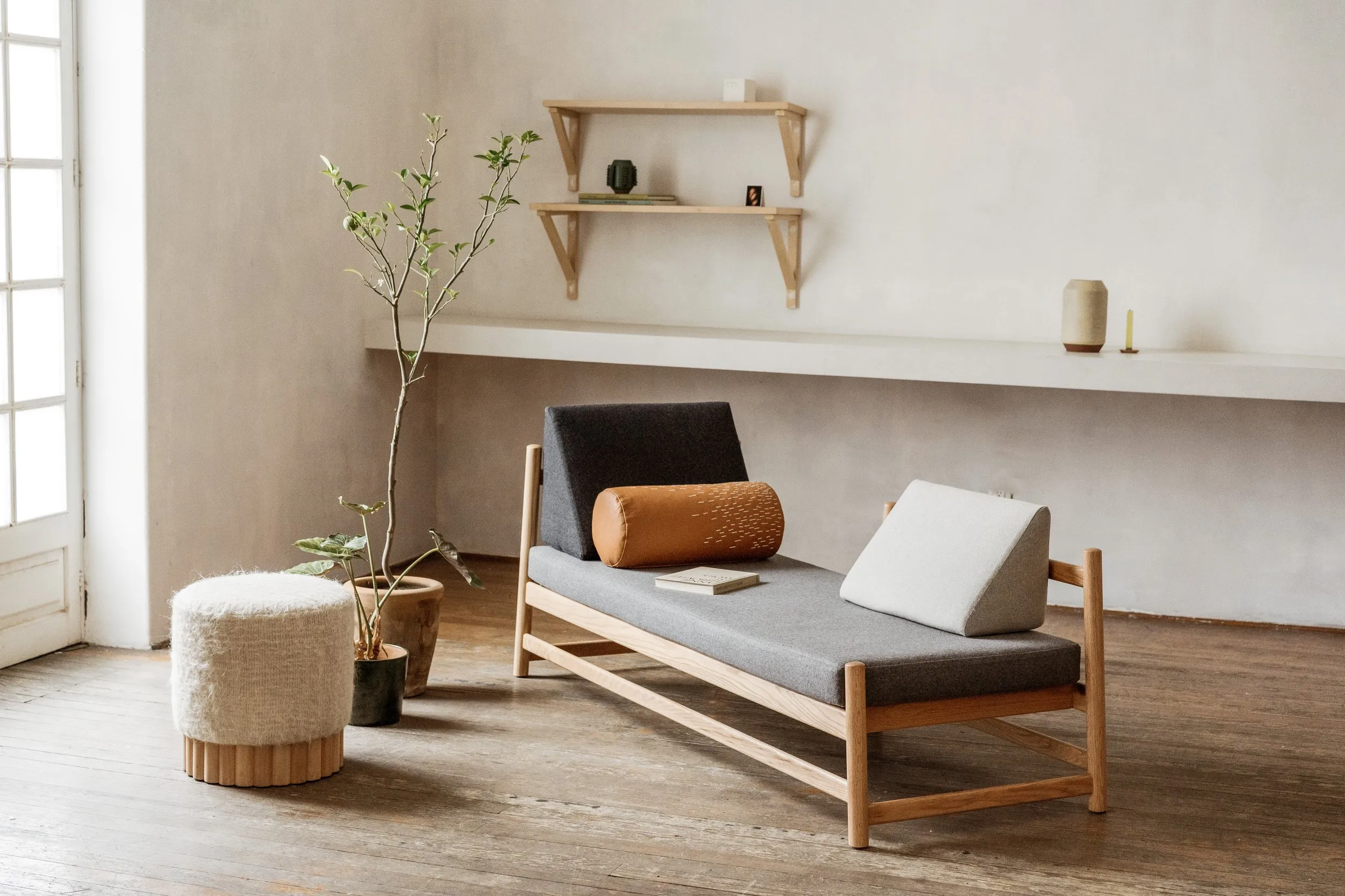 A daybed is the piece of furniture that every room needs, whether it knows it or not. The “Pita” Daybed’s subtle lines in woodturned oak invite you to take a breath, close your eyes, and halt the passage of time. Pita’s name comes from piteado, the traditional embroidery technique used on the cylindrical leather cushion whose pattern resembles falling rain. Rest your head on this cushion and the rain will wash away the weight of your day.