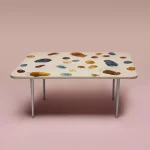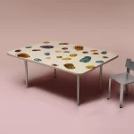 The PLANO Dining Table is a contemporary terrazzo table handcrafted with solid turned aluminium legs.