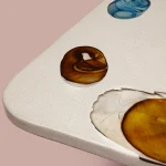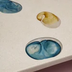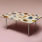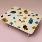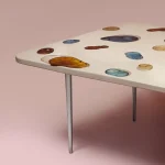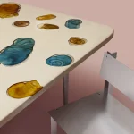 The glass pieces are handcrafted from recycled perfume bottles and carefully placed during the casting process of the table top.