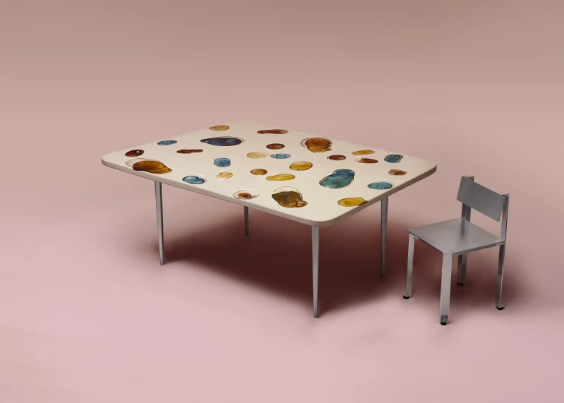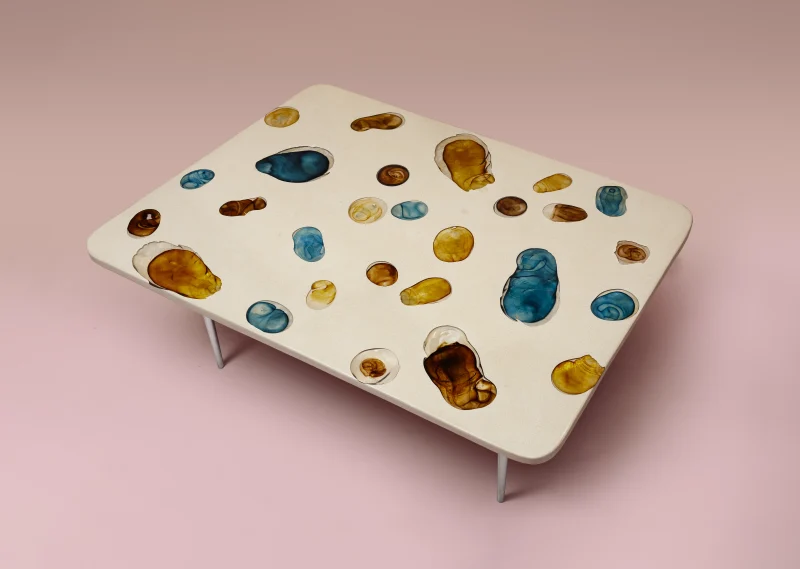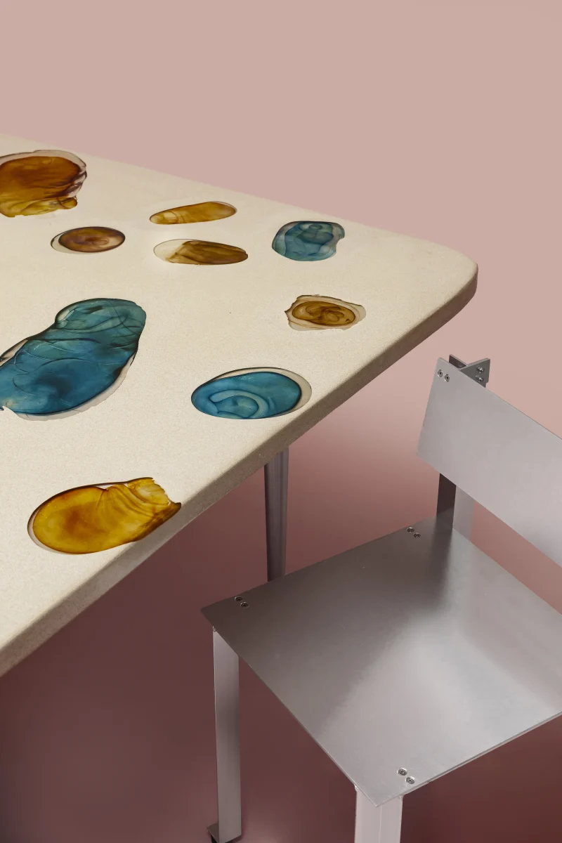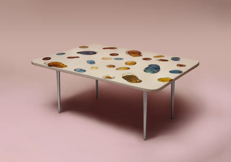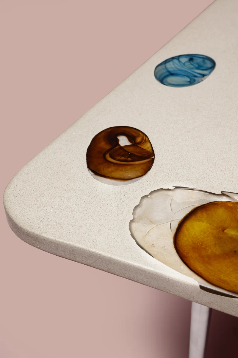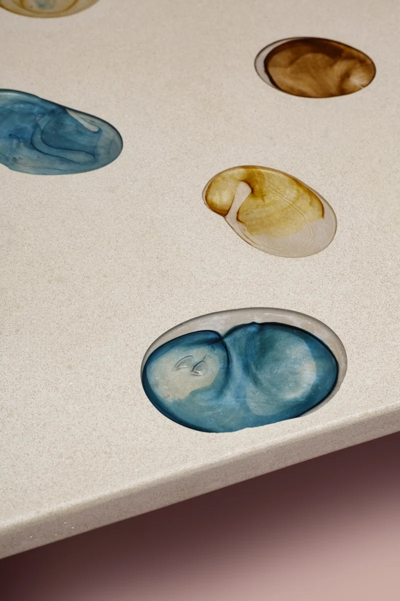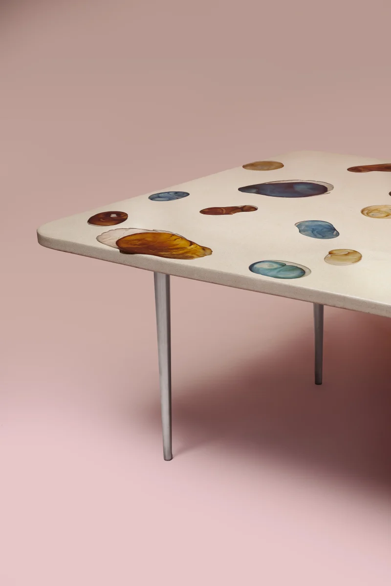 The glass pieces are handcrafted from recycled perfume bottles and carefully placed during the casting process of the table top.
