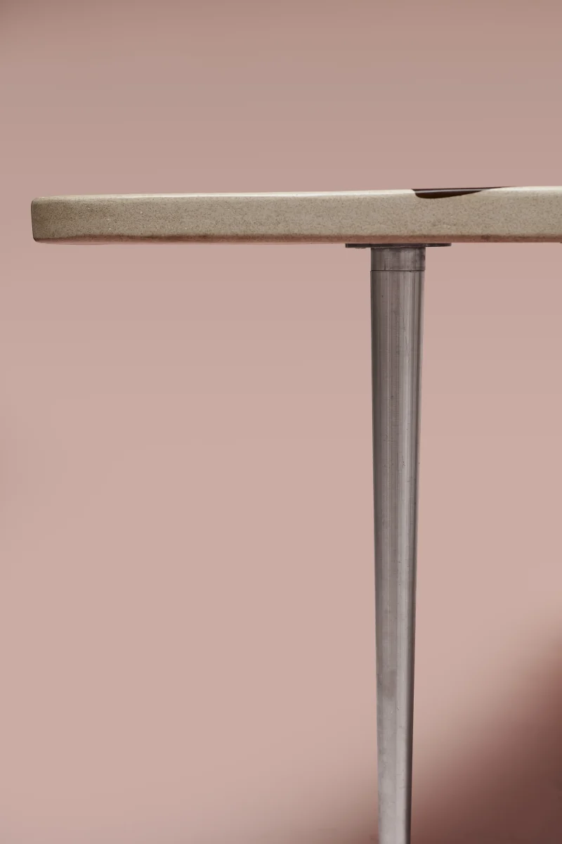 The PLANO Dining Table is a contemporary terrazzo table handcrafted with solid turned aluminium legs.