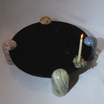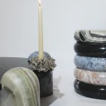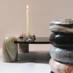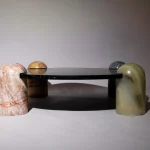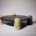 Rounded pillars of blue calcite, pink marble, caramel onyx and green onyx carry a black marble top to create Play-time Table; An elegant rendition of children’s furniture. A piece meticulously hand-sculpted from stones endemic to Mexico. The combination of materials, which reign over the piece’s final appearance, also allude to a deep Mexican folklore. The piece draws from different aesthetic references, representative of a syncretic essence in Mexican tradition.