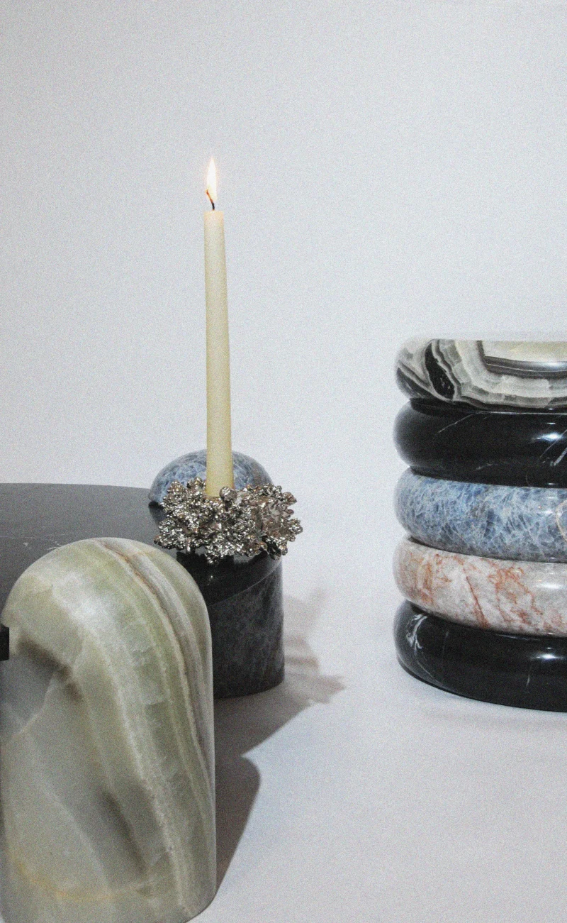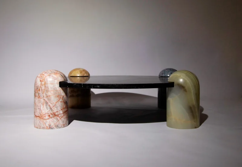 Rounded pillars of blue calcite, pink marble, caramel onyx and green onyx carry a black marble top to create Play-time Table; An elegant rendition of children’s furniture. A piece meticulously hand-sculpted from stones endemic to Mexico. The combination of materials, which reign over the piece’s final appearance, also allude to a deep Mexican folklore. The piece draws from different aesthetic references, representative of a syncretic essence in Mexican tradition.