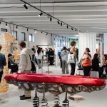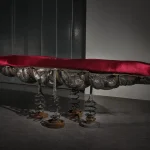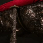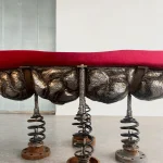 The base is made out of individually hammered steel pieces all welded together to make a solid foundation. I chose to contrast this aggressiveness of the metal with a soft, alluring red velvet textile to fit better to my narrative of sexy playgrounds. The four legs are standing on wobbly springs, introducing a bouncy rhythm when you sit on top.