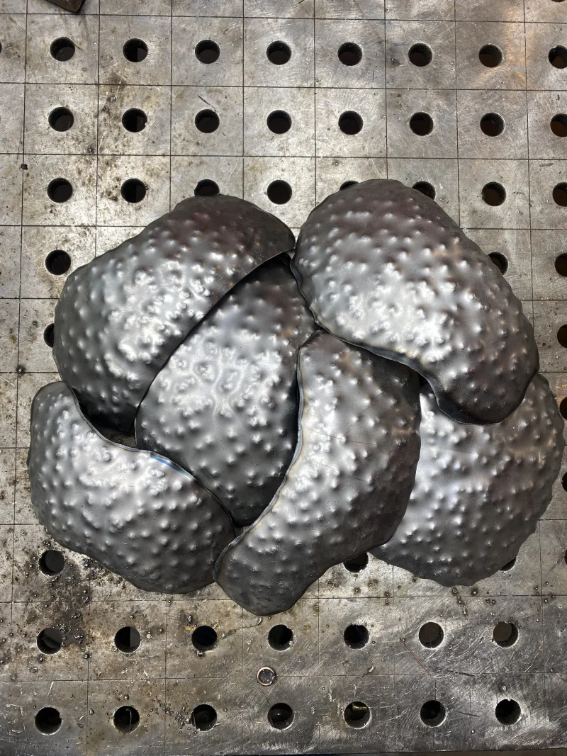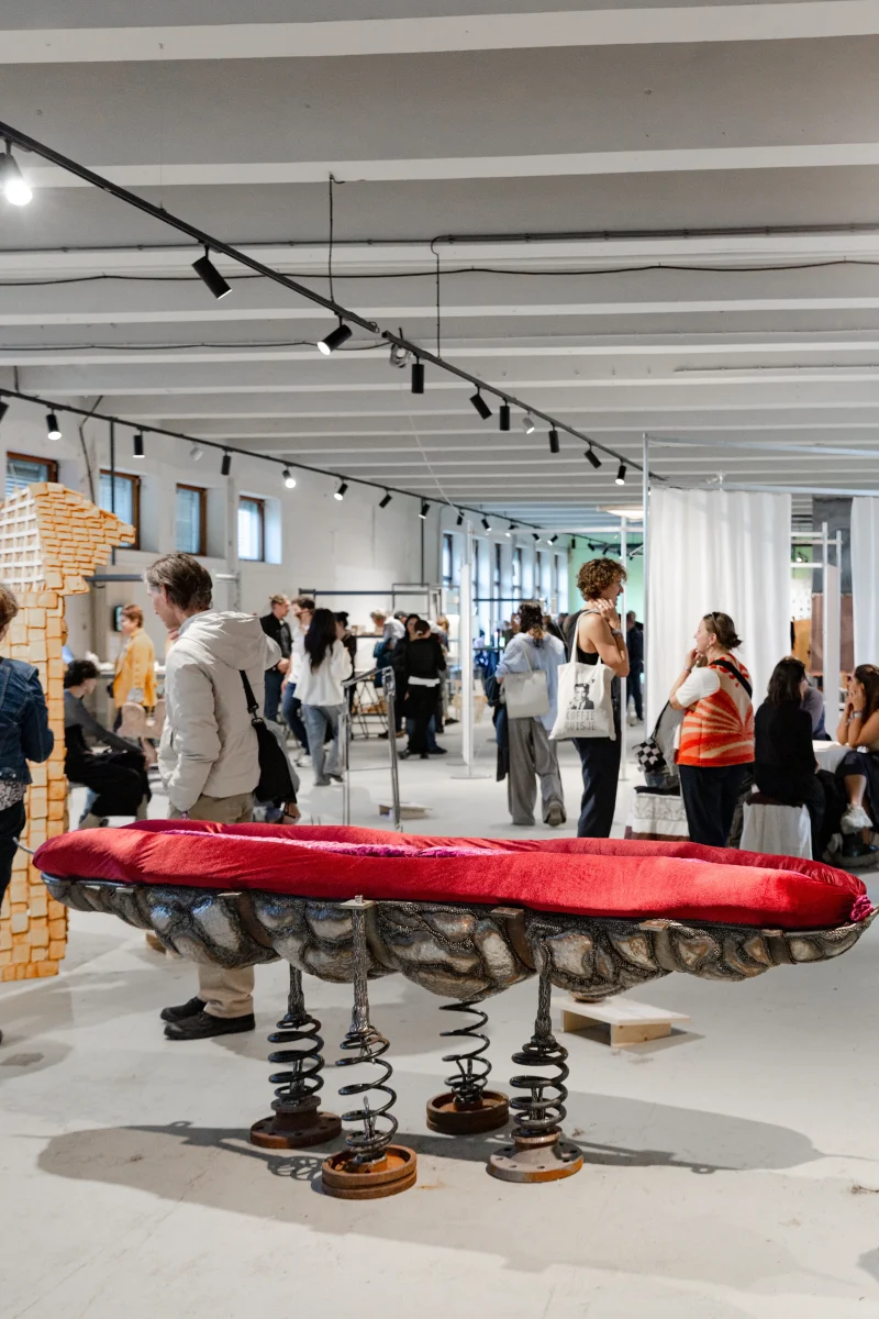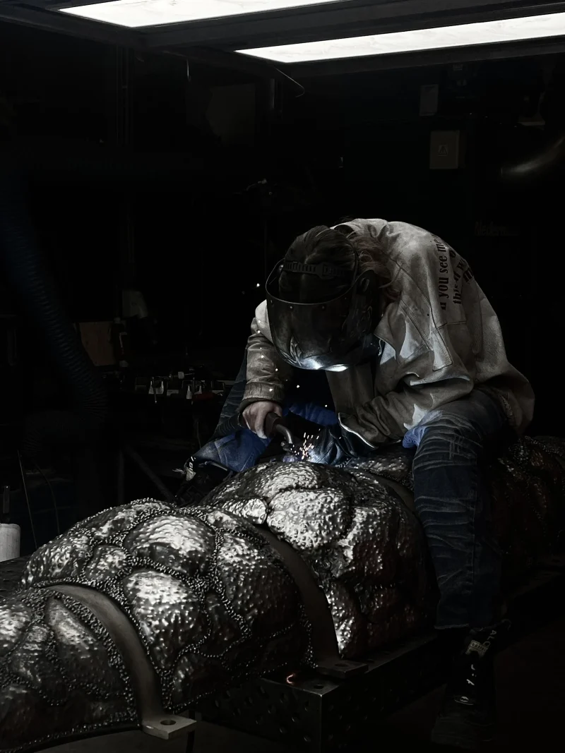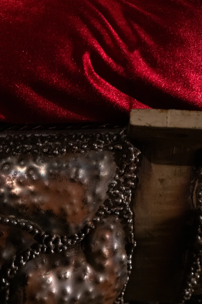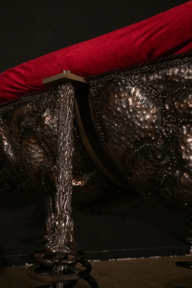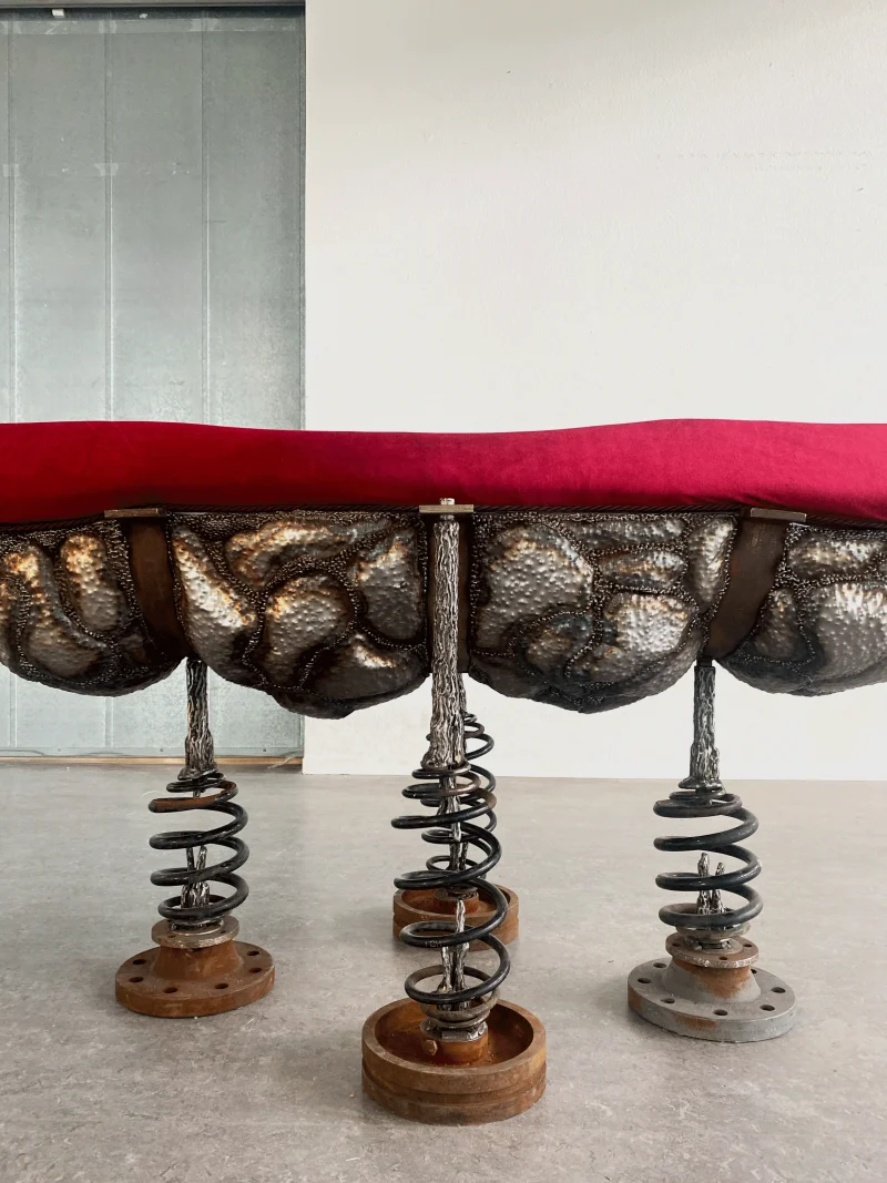 The base is made out of individually hammered steel pieces all welded together to make a solid foundation. I chose to contrast this aggressiveness of the metal with a soft, alluring red velvet textile to fit better to my narrative of sexy playgrounds. The four legs are standing on wobbly springs, introducing a bouncy rhythm when you sit on top.