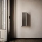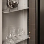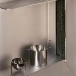 The wall cabinet by Atelier Nuanda, made of natural, light and reflective aluminium sheet, is folded and shaped into a modular element. Its shape allows it to be developed and installed transversally, thus decorating walls and composing new sinuous storage. Enriching and decorating the cabinet is the leather weave of the atelier’s workmanship, characterised by a dense, light and resistant weave that is extremely flexible and elastic in use and hold, which becomes a structural and flexible joint, allowing the door to be opened thanks to a customised hinge system.