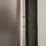 The flexibility of leather and the lightness of aluminium allow a new mechanical and functional detail to be defined in a decorative manner. The geometric motif on the aluminium surface emphasises the sinuosity of the shapes, giving rhythm to the modularity of each panels, enriching it with details and becoming the distinctive signature of the atelier. On the inside, the surface has a contrasting matt finish to emphasise the texture of the leather and the rhythm of the brass spheres that unite the two materials.